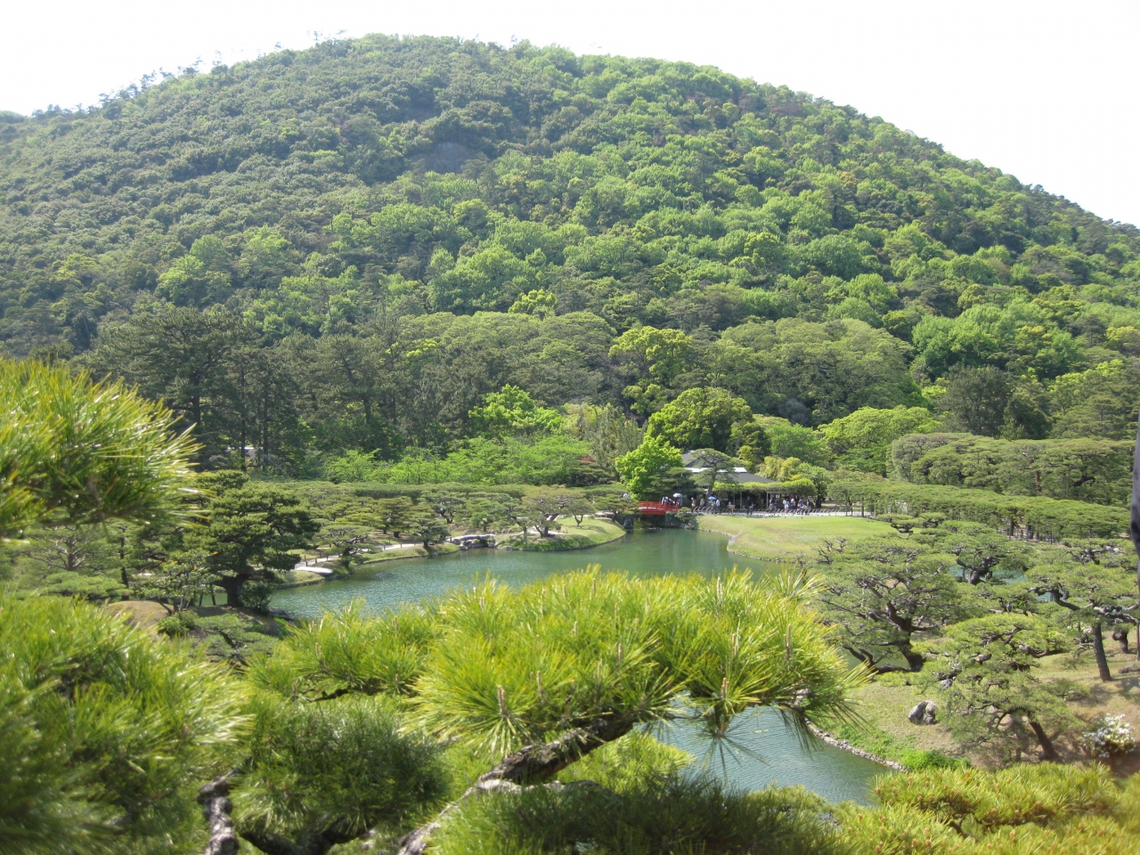 高松藩主によって完成され、たくさんの池や、松などの植物、山を配した広大な庭園です。