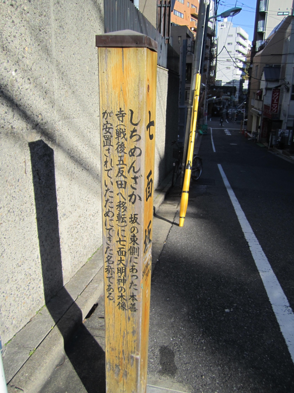 道幅ほ広くなくフツウの生活道路のようですが、標識があったので由緒ある坂だとわかりました。当時、坂の東側にあったお寺の七面大明神の木像が安置されていたためにできた名称だそうです。
