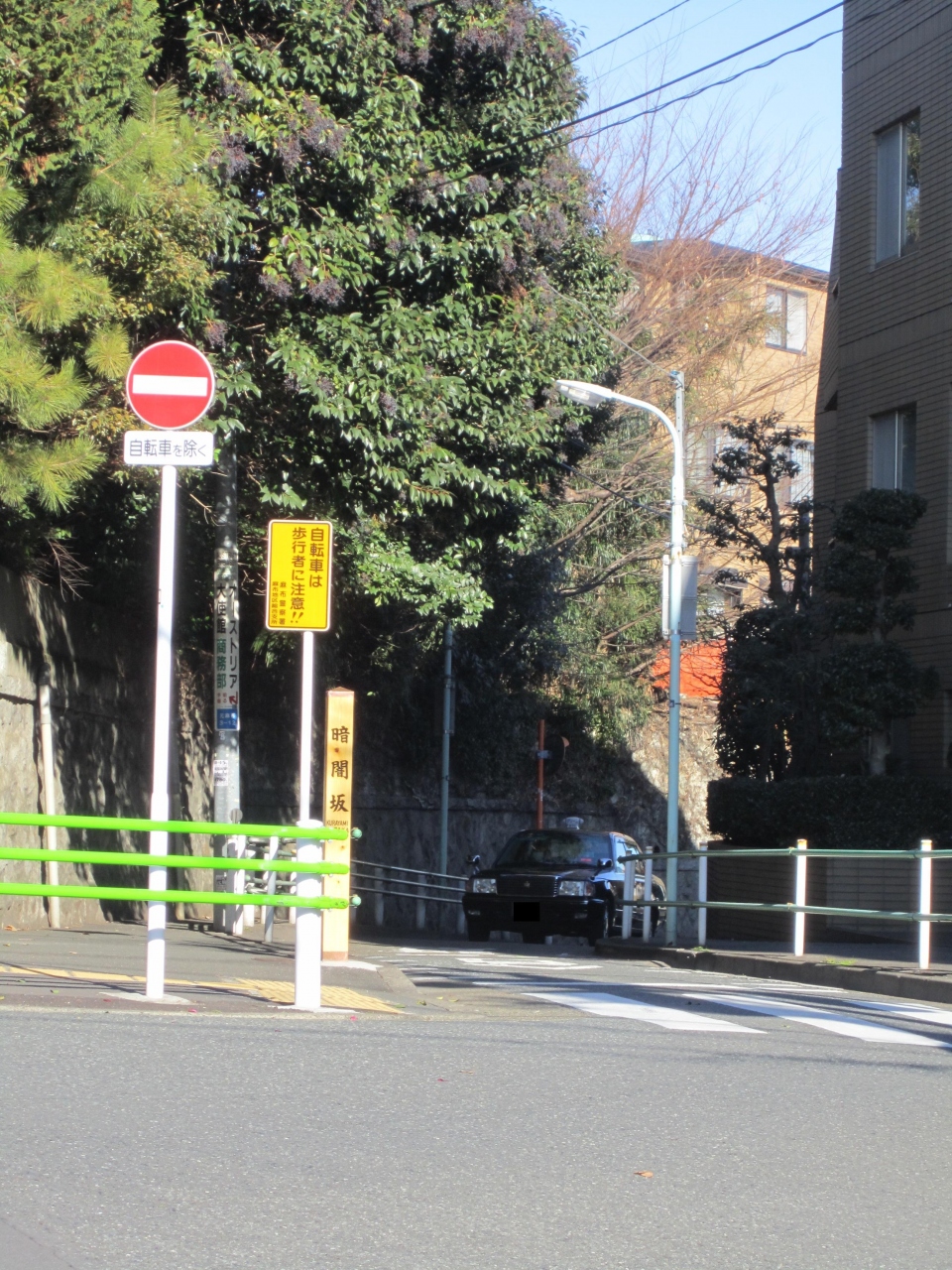 狭い坂道ですが、木があって雰囲気はいいけど、ちょっと危ないかんじの坂でした。(子どもが自転車でおりたりするのは怖い感じ。)車も通っていました。