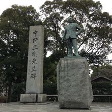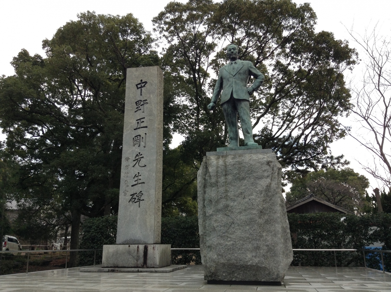 中野正剛先生顕彰碑は、唐人町の黒門交差点の近く鳥飼八幡宮のそばに明治通りに面して立っています。