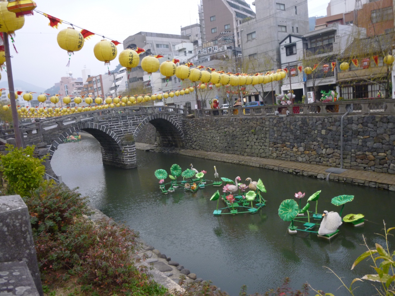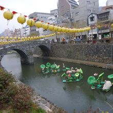 中島川にかかる日本最古のアーチ型石橋と紹介されていますが、興福寺の唐僧によって築造されたそうです。中島川には、その他の石橋もあり、丁度、ランタンフェスティバルで、その飾り付けが、鯉が泳ぐ川の中と、公園にもありました。