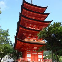 厳島神社のすぐそばにある小高い丘の上に立つ五重塔です。残念ながら中は公開されていないため入ることはできませんが、近くで見ると高さと鮮やかな色が良く分かります。また、遠くから見る風景も町や神社の中に五重塔が溶け込んでおり、風情があります。