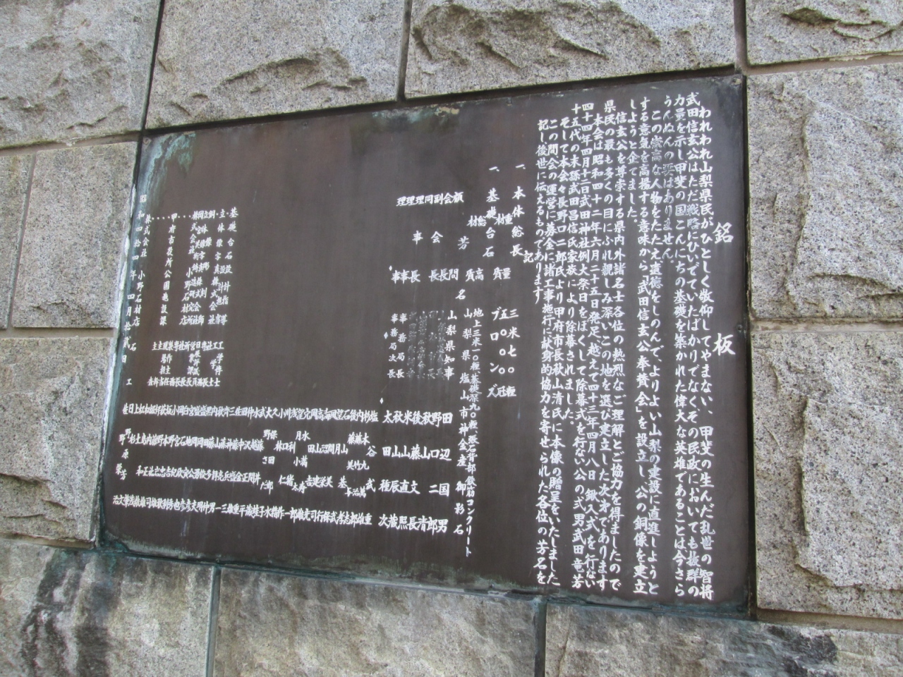初めて「甲府」駅で下車し、何も分からないまま駅の南口から外に出ると、右手に銅像があることに気付きました。近づいて見ると…やはり想像した通り「武田信玄公像」とありました。甲冑姿の堂々とした「武田信玄公像」台座側面には銅像建立に尽くした方々のお名前、台座裏側には銅像建立の趣意が記されており、この銅像が多くの山梨県民の浄財にと協力によって建立されたことが分かります。また銅像横には信玄公の略歴が記されたプレートも建てられており、信玄公が今も郷土の英雄であり続けていることを知ることが出来ました。