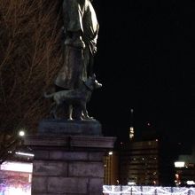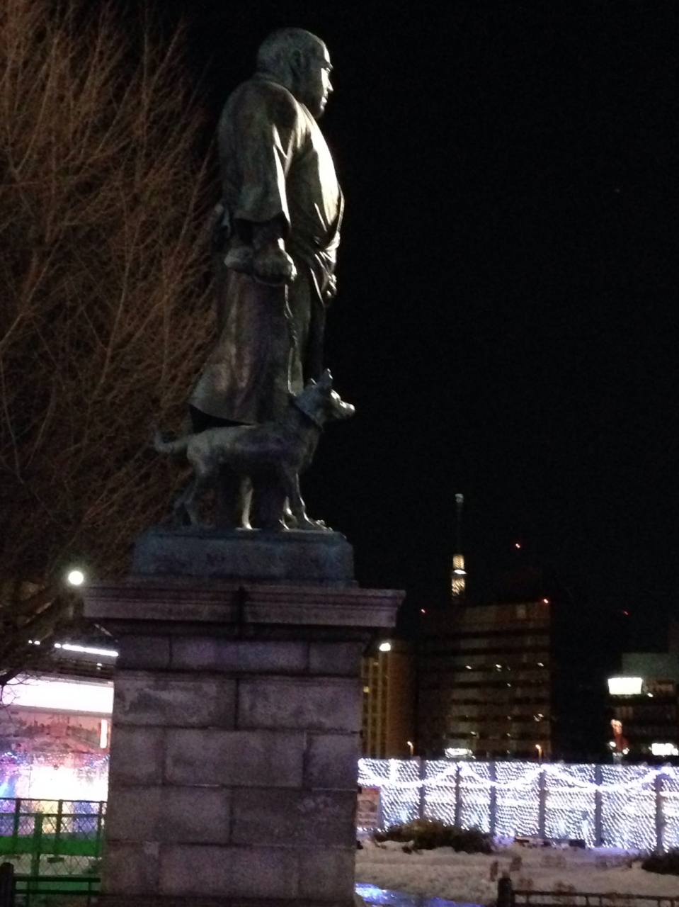 雪のため、急遽、上野で電車を降りることになったので、久しぶりに西郷隆盛の銅像を見に来ました。夜ですが、銅像の周りには結構、人がいました。銅像を、横から見ると、スカイツリーと西郷さんが一緒に観れました。