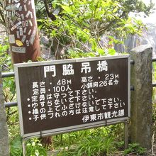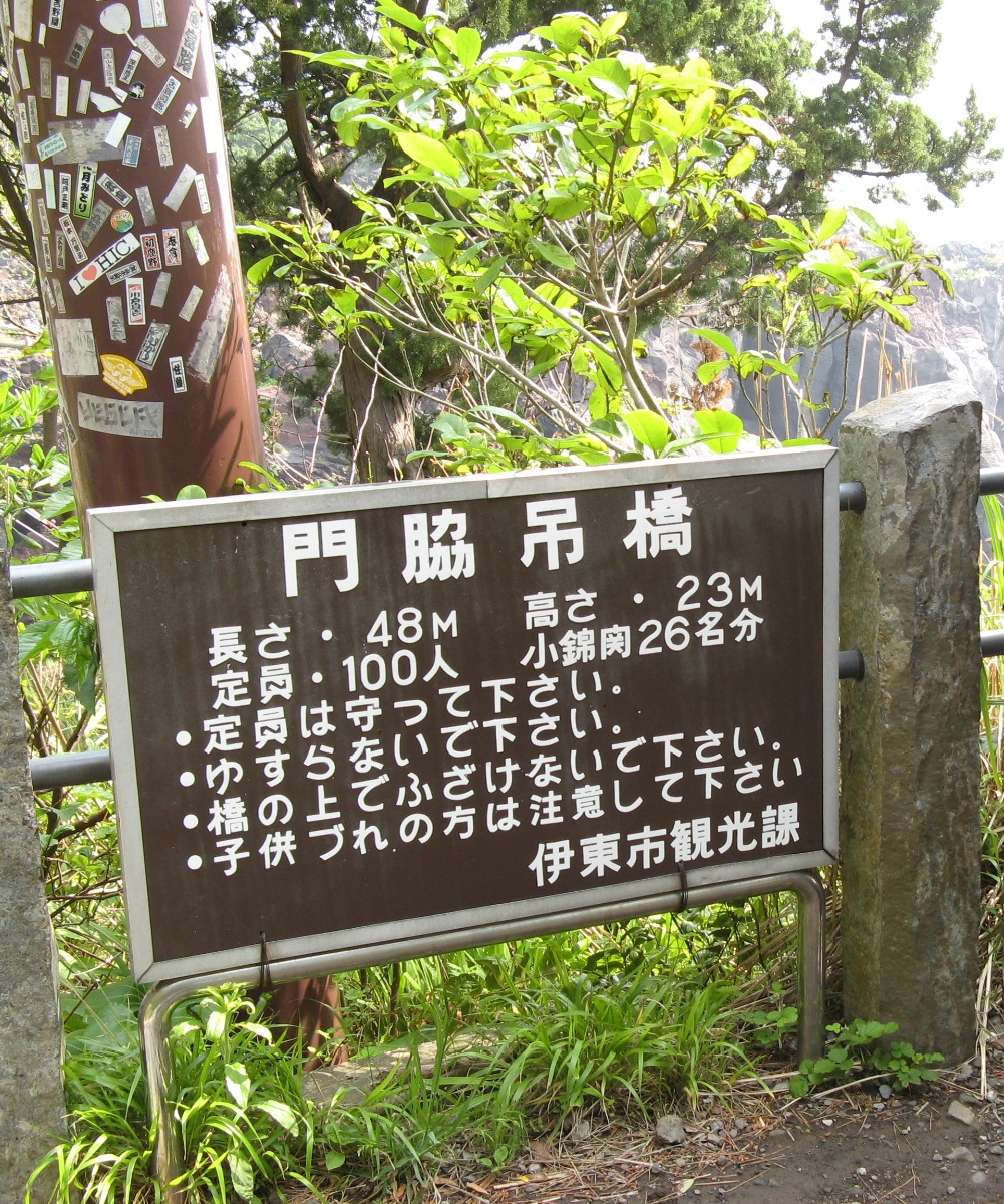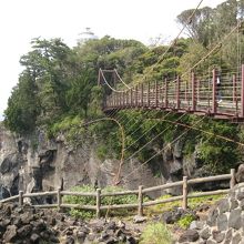 駐車場(有料)から歩いて3分ほど、半四郎落しと門脇岬の間の海蝕洞にかかる長さ48m、高さ23mの吊橋です。断崖絶壁のスリルを味わうことができます。東伊豆を代表する観光ポイントで、観光客は結構多いです。
