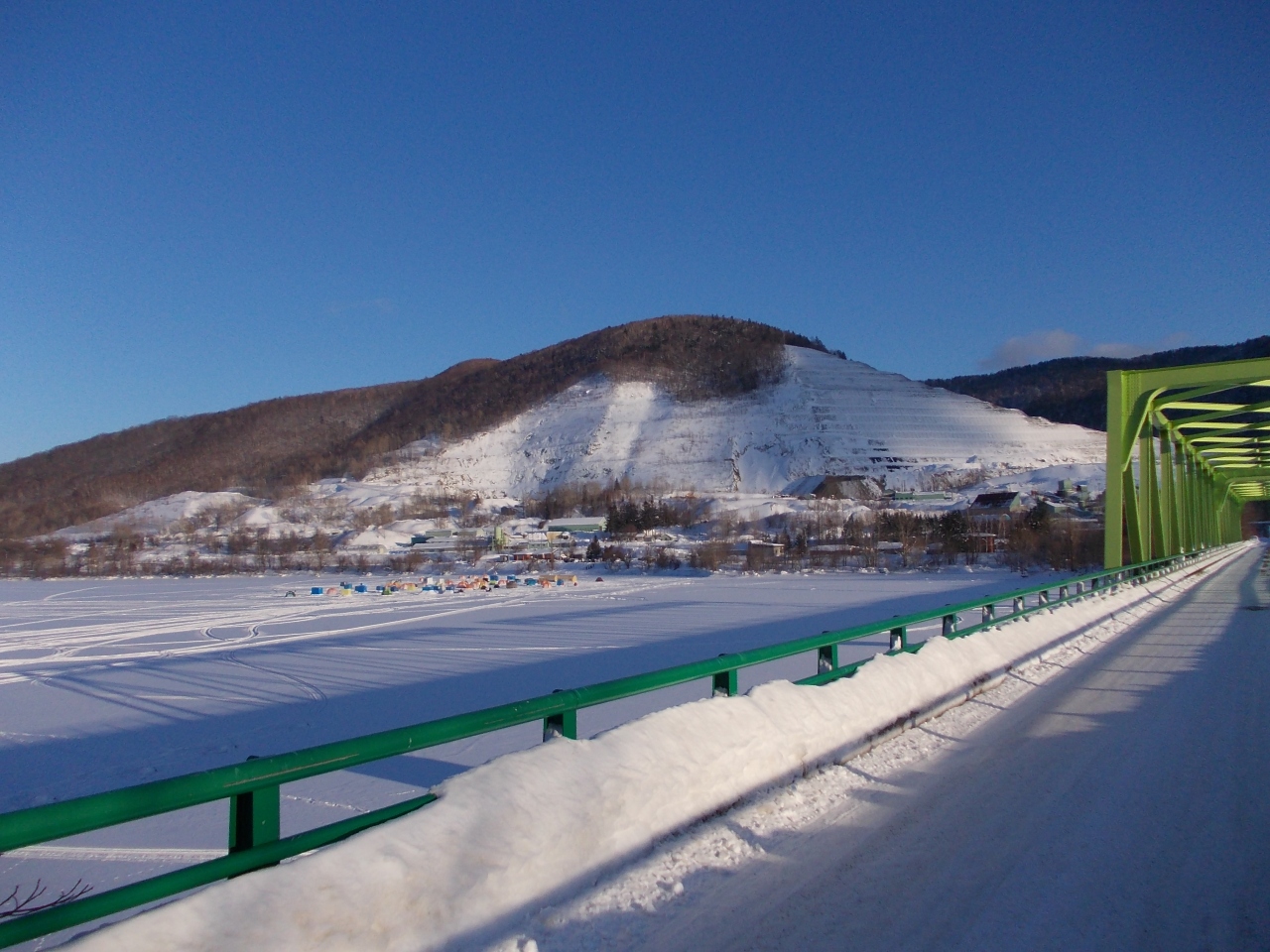 途中の橋のちかくにはワカサギ釣りの色とりどりのテントで賑わっていました。