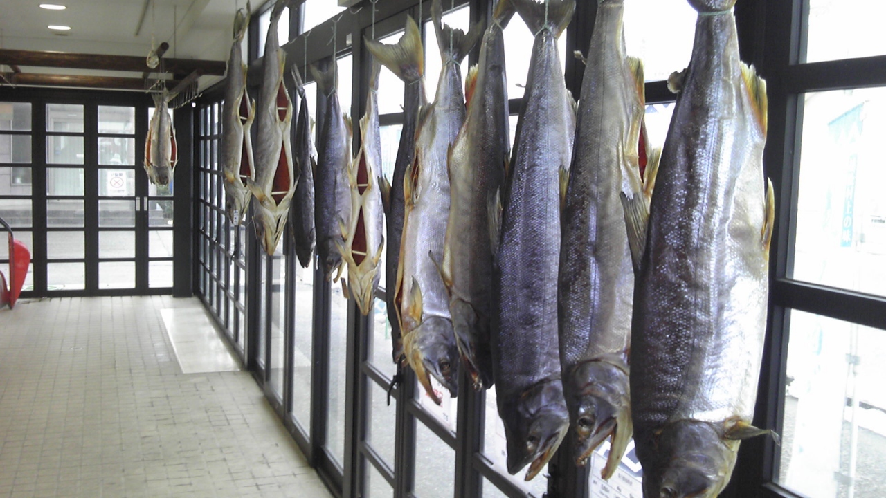 新潟県特にこの村上界隈に来た時にはこの冬の時期は必ずと言っていいほど、塩引き鮭を買っていくことが多いのですが、今回はJR村上駅から車で5分ほどのところ、永徳本店さんに訪れました。蔵をイメージした建物で2階にはたくさんの鮭が吊るしておりました。店の軒先にも当然吊るしてあって買い物客の購入欲を沸かせます。塩引き鮭は切り身より絶対、丸ごと一本で買うことをお勧めいたします。やはり切り身が空気に触れることにより鮮度が確実に落ちますし、新鮮な切りたてをすぐ食べる贅沢さは丸ごと一本を買った時にしか味わえません。中骨と中落ち、頭もすぐに焼いて、なるべく半生程度の方がまたよいですね。お土産の地酒とグイッとやればなお最高です。それでは永徳さんの塩引きですが残念ながら地元村上産の鮭は置いてなく、全て北海道産ということですが、特に北海道だろうと何処であろうと実際は遜色はありませんでした。いつも必ず村上産にこだわって買ってきた私ですが、今回で村上にこだわる必要もないのかなと思いました。過去いろんな大きい店やそれこそ個人の魚屋さんレベルのところで塩引きを買い、極端にしょっぱかったり、そうでなかったりいろいろでしたが、ここ永徳さんの塩引きはけっこうマイルドな塩加減です。塩が強い奴だと切り身二三切れ食べただけで喉が渇いて水を欲することも多々あり。この永徳さんの鮭は私にあった塩加減かなと思いました。4kg前半で7,400円ということでそれほど高くはなく、まあまあの相場ではないかと思います。