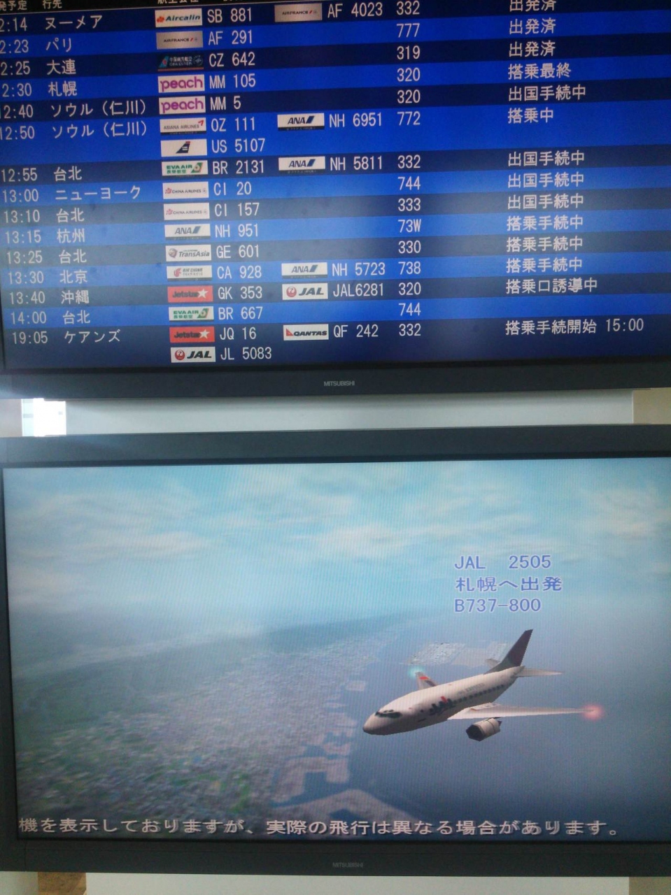 スカイデッキには、次に離着陸する飛行機の航空会社と機種などが表示されるモニターがあるので、女性や子供にもわかりやすく飛行機を見れます。
