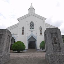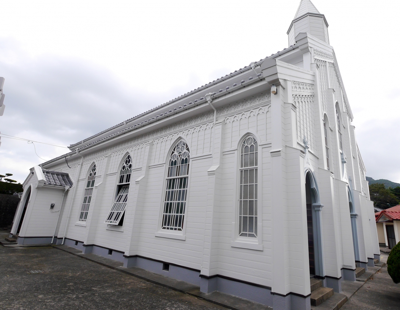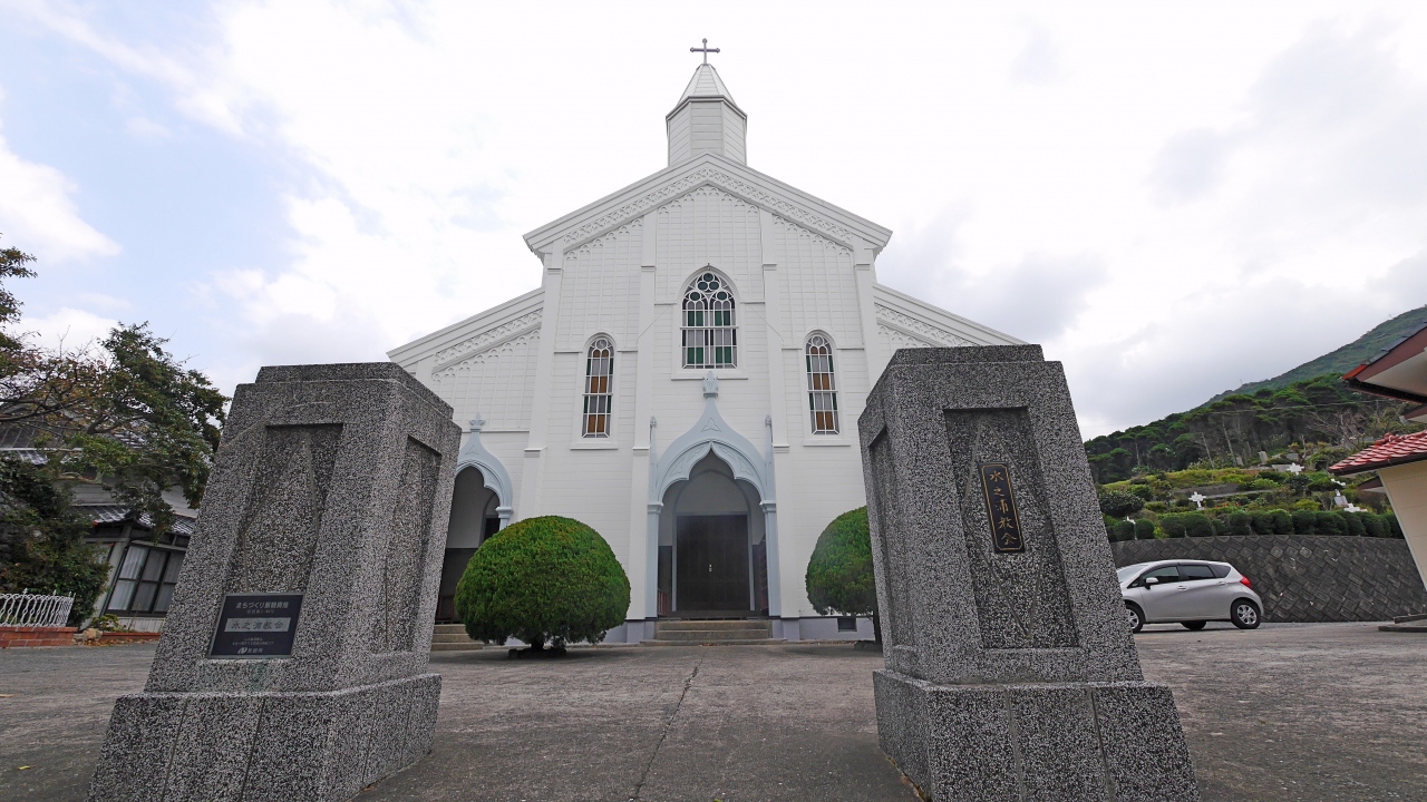 水の浦教会は1938年に白亜の木造教会として建てられた.上五島の中ノ浦教会に似ているが,後の時代なので大きい!長崎の教会をたくさん造った鉄川与助氏の設計.最初の教会は1880年.明治初期の迫害を物語る牢屋跡地もある.長崎に多くあるフランスルルドの奇跡のマリアをまつっている.必見の教会