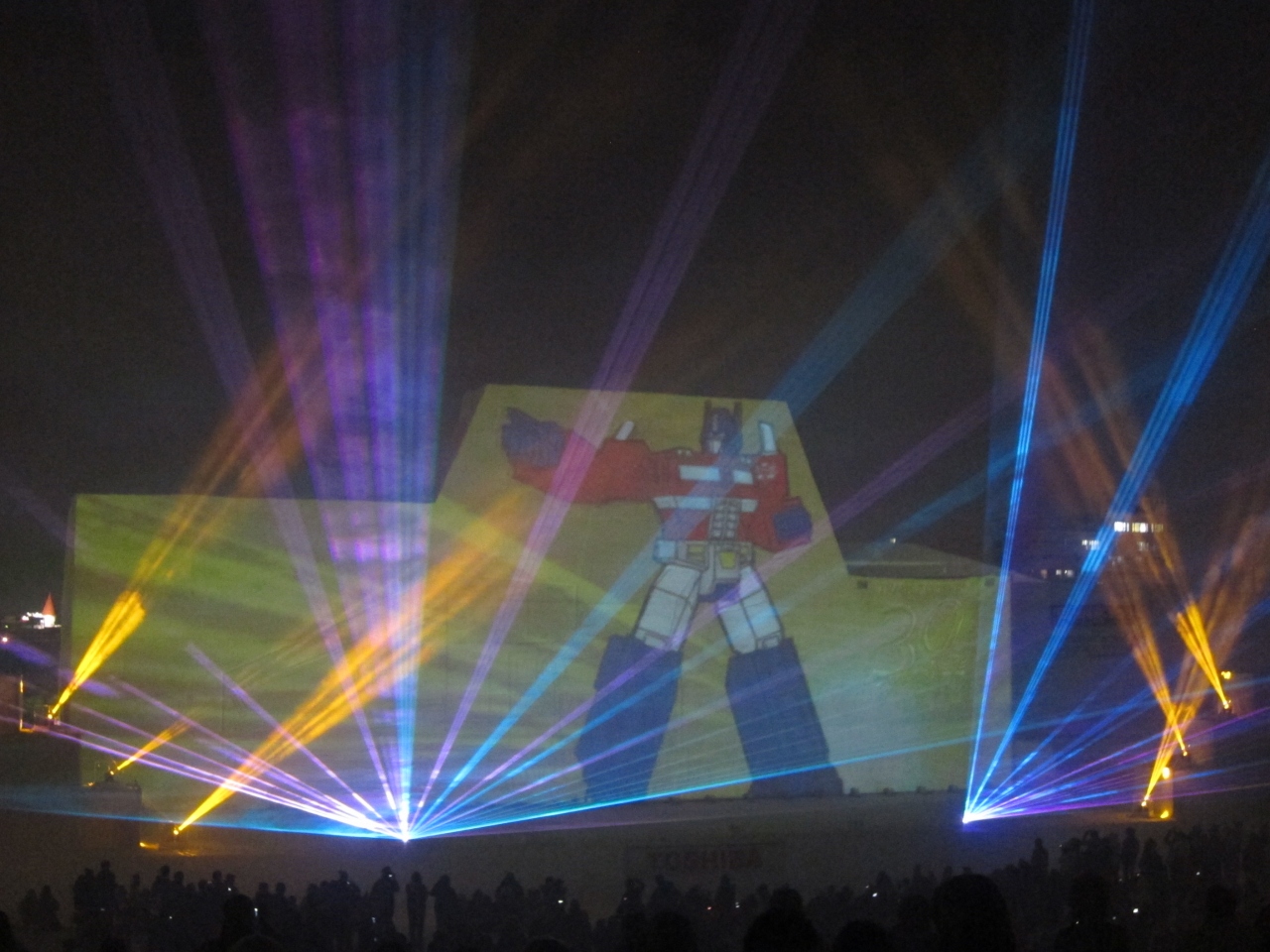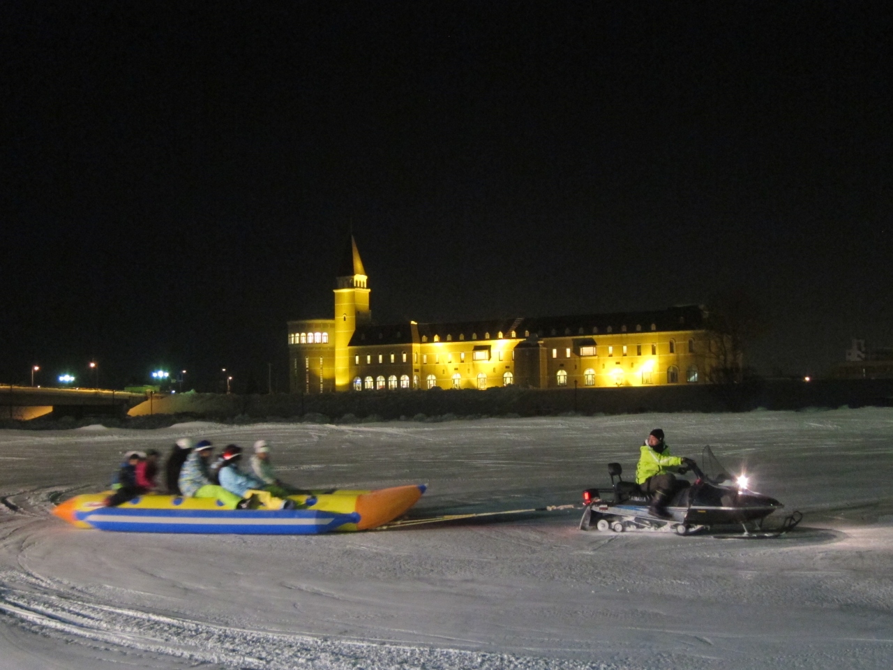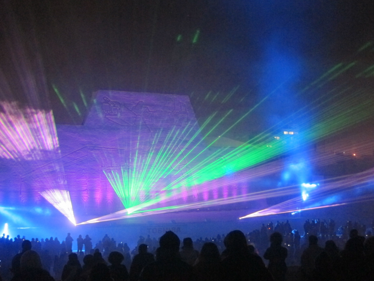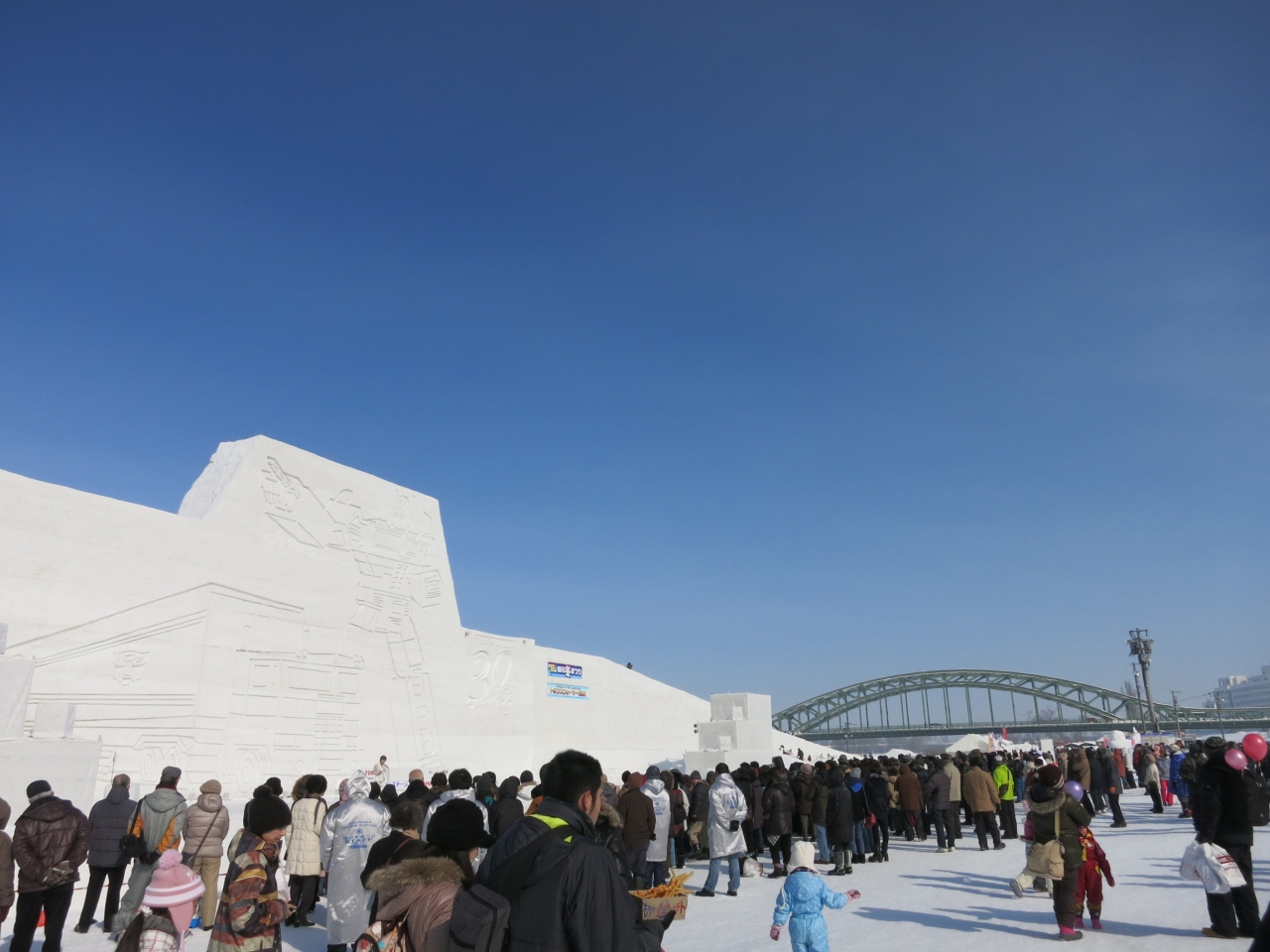 地元の町おこしのお祭りという雰囲気でした。そして、子ども向け(子どものいる家族連れ向け)のアトラクションが数多く用意されています。石狩川の河川敷にある会場には、大雪像?というより、雪でできた大舞台と、そのスクリーンに子ども向け巨大ロボ(トランスフォーマー)の描かれた雪の壁画が、会場に一つドカーンとありました。ロング滑り台も兼ねています。また、会場には、タイヤチューブで土手の雪面を滑り降りたり、スノーモービルが牽引するバナナボートに乗ったり、雪の巨大迷路に挑戦したりと、いずれも子ども達が大はしゃぎしていました。