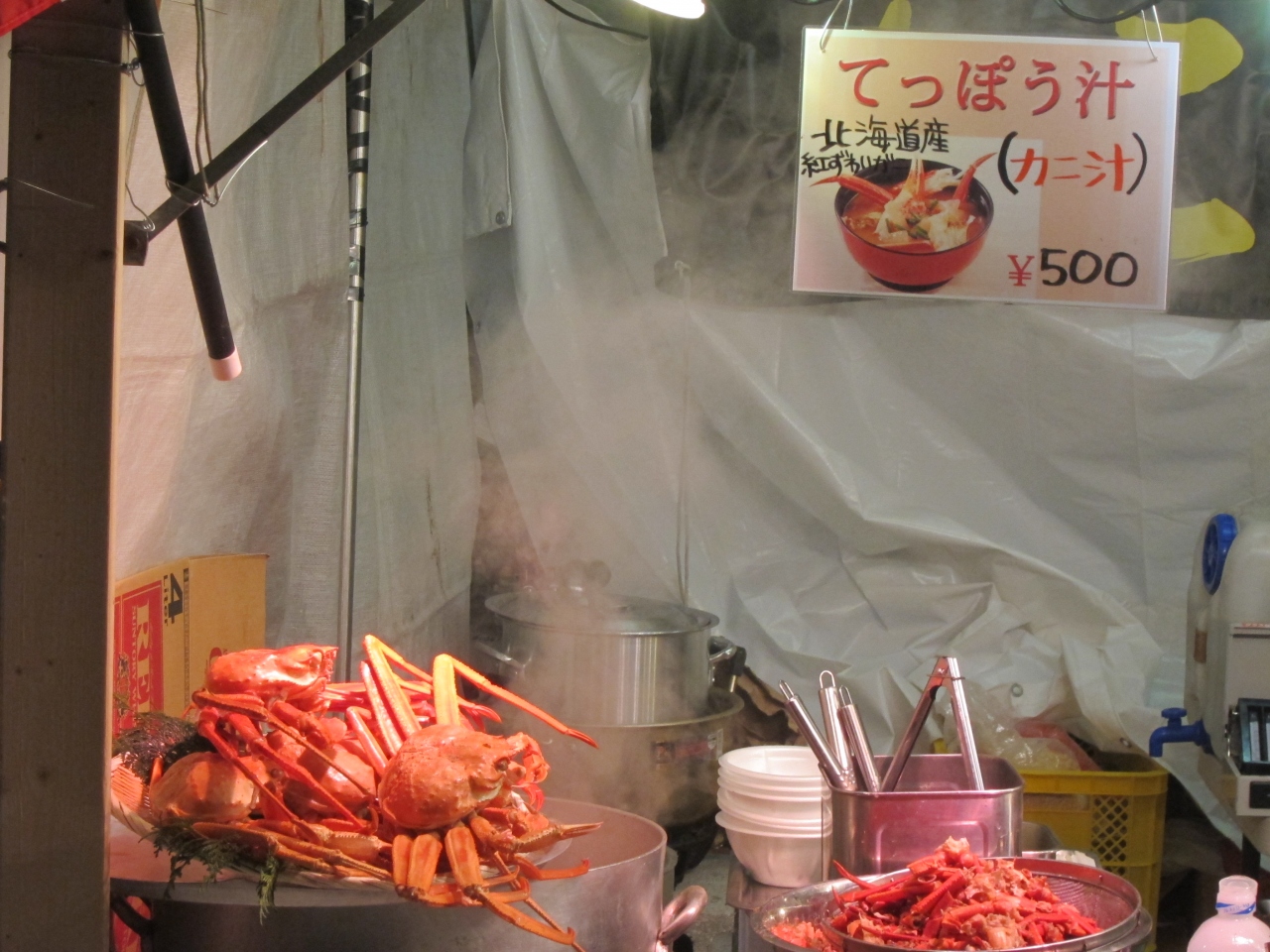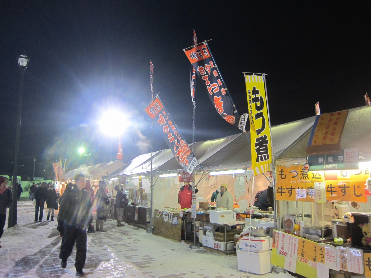 なお、小さい子どものいる家族連れでなくとも、屋台村や光のショーは楽しめるのではないでしょうか。屋台村(冬のマルシェ)では、旭川ラーメン、てっぽう汁(かに汁)のほか、旭川や道北の街のB級グルメなどがありました。光のショー(光と音のシンフォニー)は、毎日、夜の19時と20時の2回、9分程度の、レーザー光と3Dマッピングのショーが行われます。特に初日と最終日は花火も打ちあがるようです。わずか9分ですが、じっとしていると、とても寒いです(旭川駅前の電光掲示板が-10℃でした)。