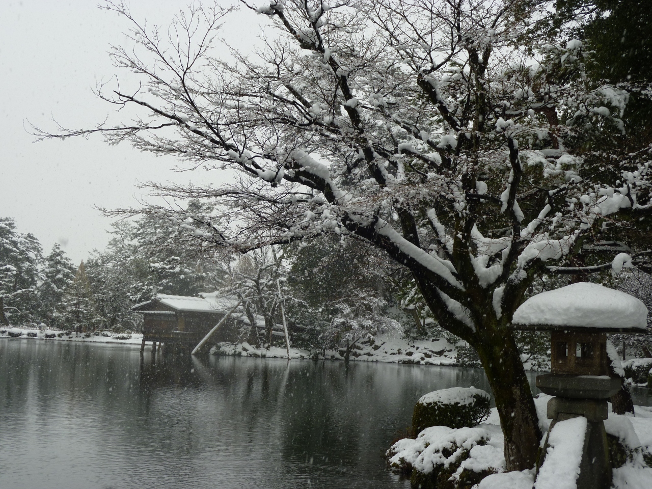 はい雪の舞う庭園では、唐崎松を中心に“日本三名園”の名に