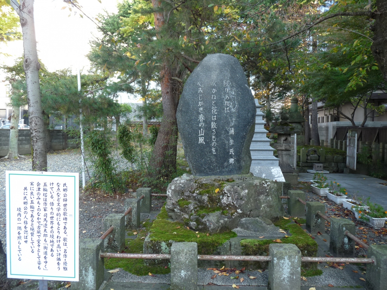キリシタン大名で伊達政宗のあとに会津を統治した蒲生氏郷の墓です。商店街から一本裏手に入ったお寺の境内にあります。