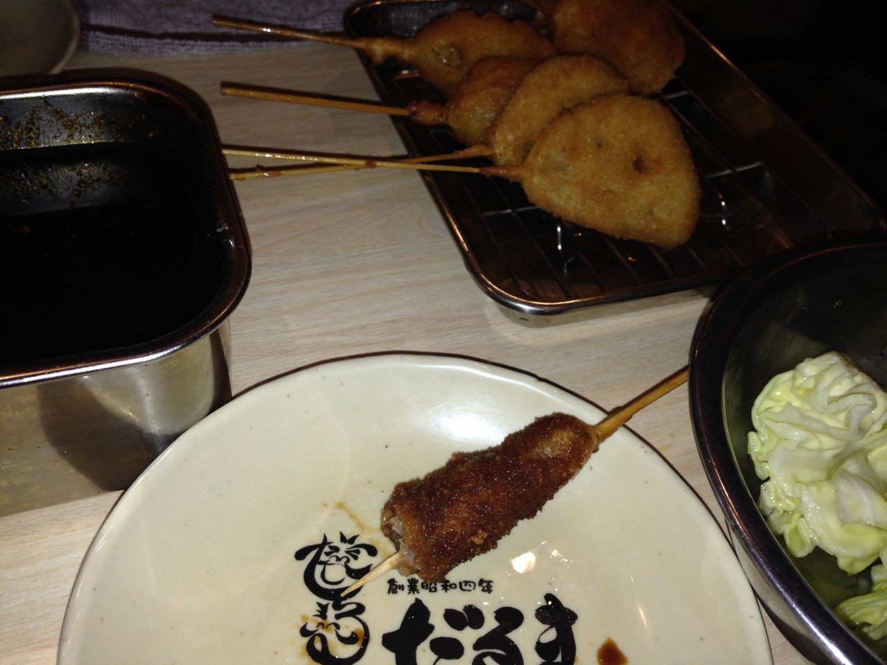 言わずと知れた串かつ有名店とあって、ひときわ行列が目立っていました。でも回転も速いので、ラストオーダーぎりぎりに入っても事前オーダーで、即いただくことができました。場所柄か女子率が高く、気軽に入れる雰囲気です。衣はサックサク、甘いソースが後引く美味しさでした。