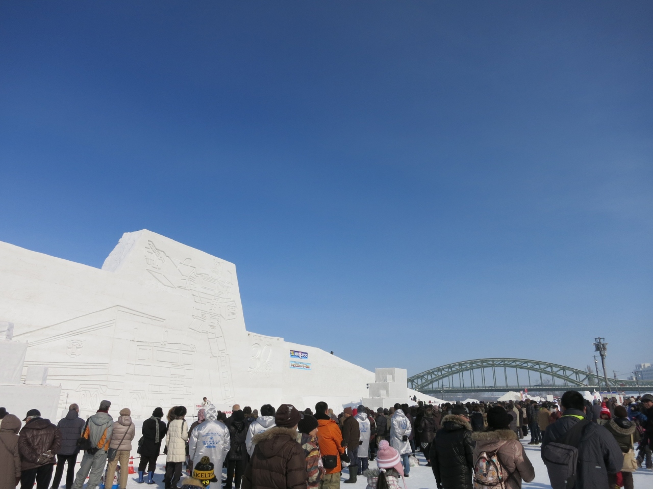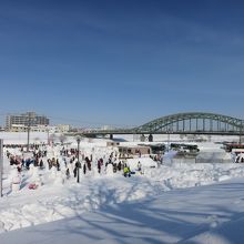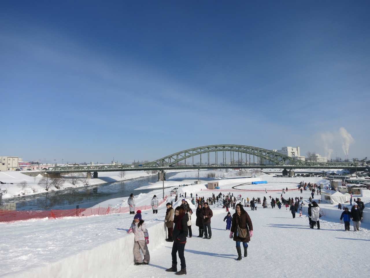 付近の河川敷では、ちょうど旭川冬まつりが開催されていて(2月6日~11日(2014年))、多くの家族連れなどで賑わっていました。