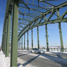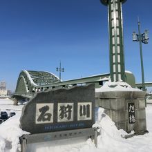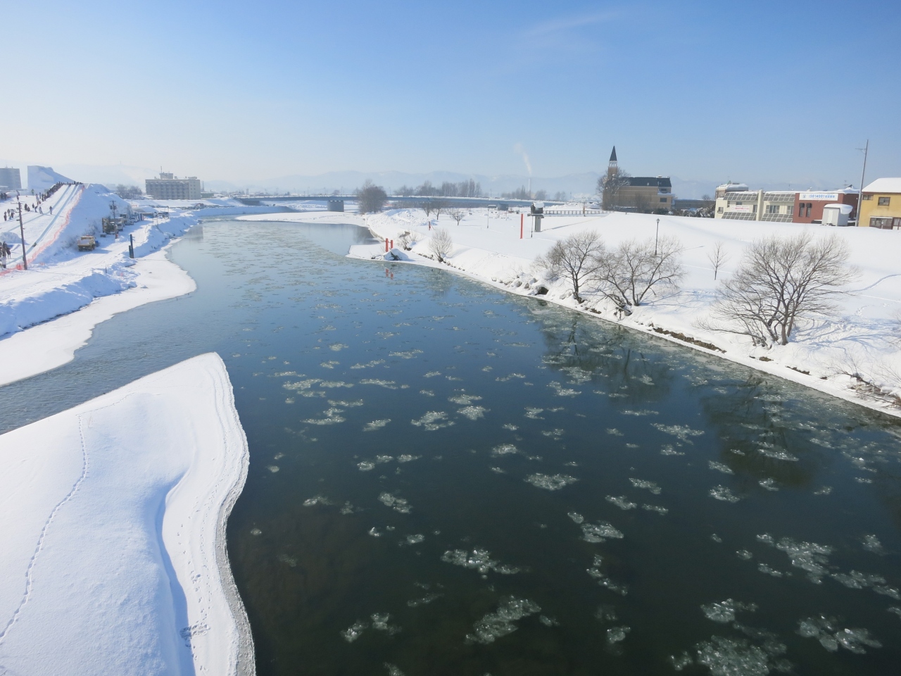 旭川駅前から北へ1.5kmほど離れた石狩川にかかる橋です。列車で旭川駅に着くと、南側に忠別川が流れていますが、こちら側ではありません。