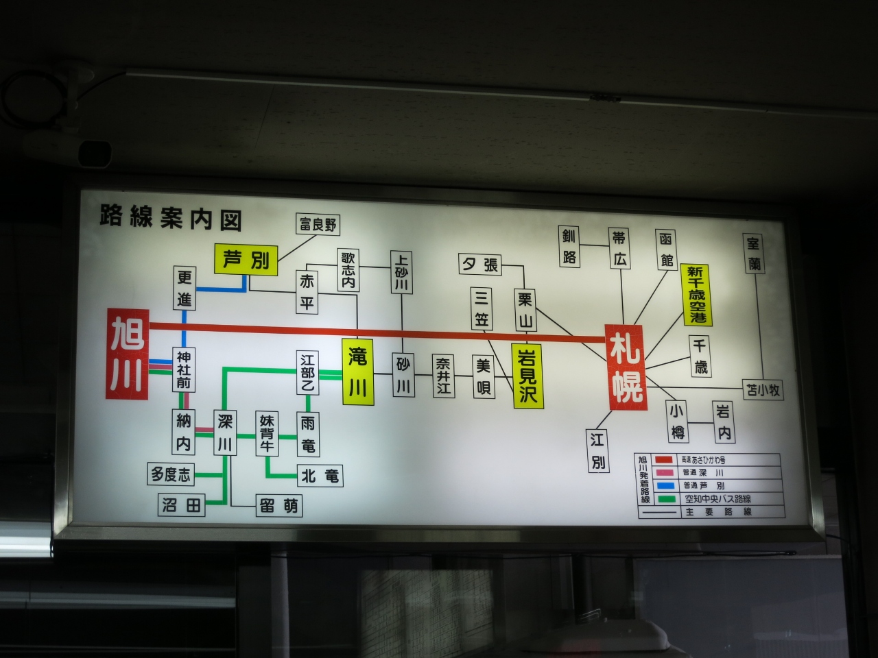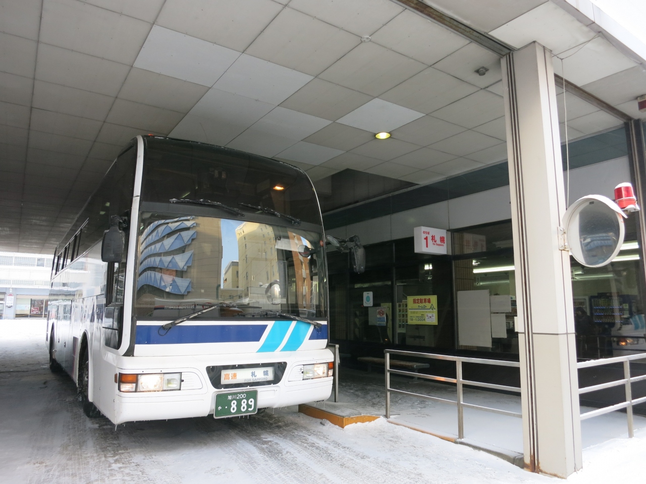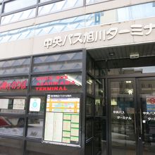 旭川駅の北口の西側の出口から、200mあまりの1条通に面した1条7丁目にあります。駅からは、駅前の宮下通と次の細い路地を越え、次にある1条通を少し左にずれた所です。比較的、駅に近い場所にあります。札幌までの高速バスも発着し、JR北海道の特急スーパーカムイの好敵手となっています。両者を比較するとこのような感じです。