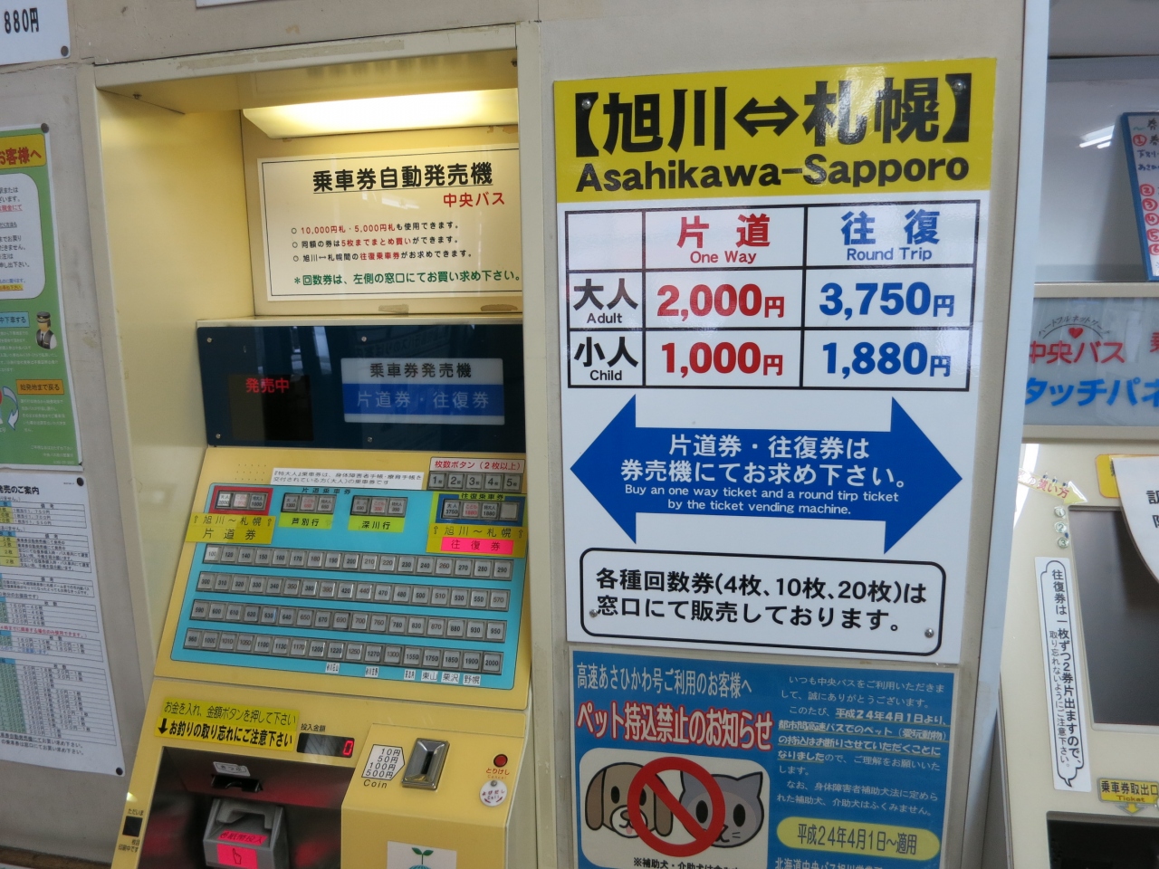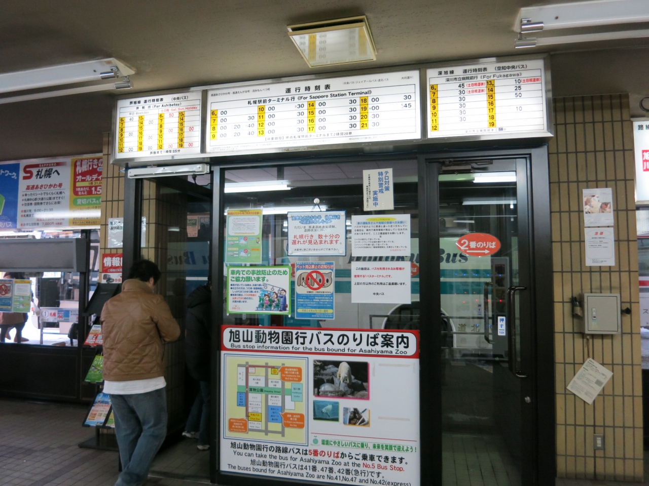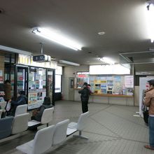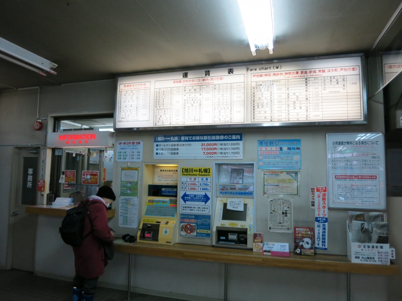中央バスターミナルの待合室には椅子が並び、切符の販売窓口や飲料の自販機があり、いつもテレビが点いています。比較的安いビジネスホテル(ホテルパコ旭川)が隣接しているので、夜遅い便や朝早くの出発にはとても便利です。
