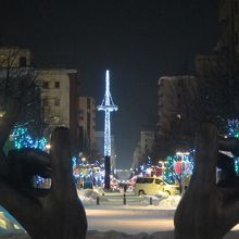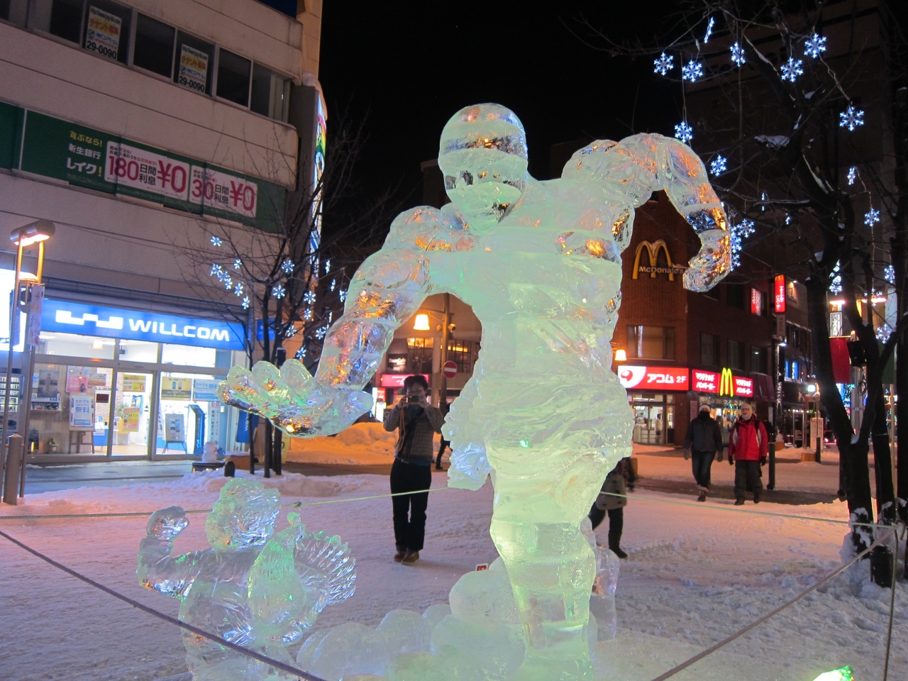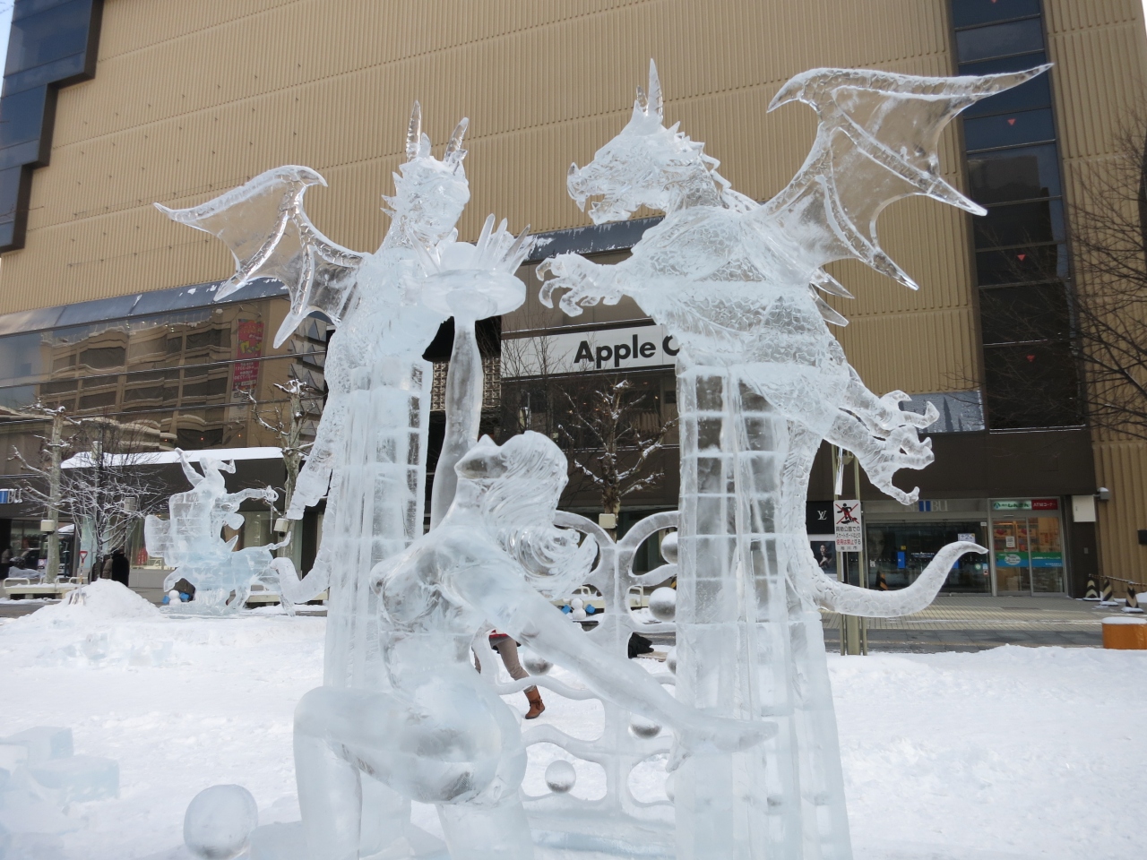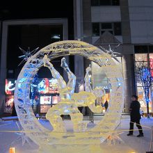 平和通買物公園は、旭川駅の北口、西側の出口からまっすぐ、駅前通りの宮下通~8条通の1kmほどの歩行者天国です。8丁目の通りにあたります。そして、駅近くから、だいたい7条通のあたりまで、大会期間中、通りの両側に美しい氷像が立っていました。夜ともなるとイルミネーション(あさひかわ街あかりイルミネーション・12月~2月11日〔2014年〕)に氷像のライトアップが加わり、更に美しさが増します。どの氷像にもカメラ片手に巡る人たちが貼り付いていました。ただ、ときどき交差する車道の信号待ちや、無信号の交差点も多く、なかなかのんびりとそぞろ歩きという訳にはいかないようです。