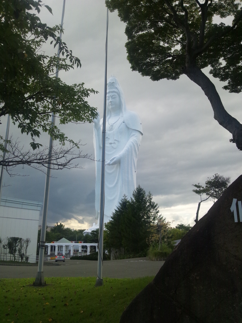 わざわざ観光しに行くような場所ではありませんが、青葉城址とか仙台市内の高いところからであればどこからでも見えます。近くに行けばショッピングモールの屋根の上から観音様がそびえたつシュールな景色を見ることができます。