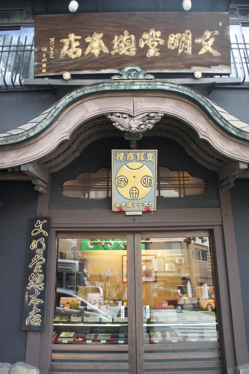 文明堂 総本店は、大波止の交差点角にあります。窓のない真っ黒な壁の建物が歴史を物語っていますが、何でこんな場所にあるのかはちょっと不思議です。店内には、きれいな焼き物が飾られたガラスケースがあったりして、少し異国情緒も感じながら買い物ができます。