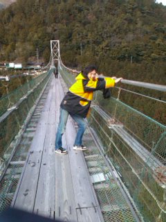 橋の幅は意外にも広く、人が難無く行き交う事ができるが、言い方を変えると両手で手すり(ワイヤー)を握る事はできない。しかも、数人が一緒に橋を渡ると、体重の移動で橋が上下左右に揺れ始める。橋の中央部はスリル満点だった。