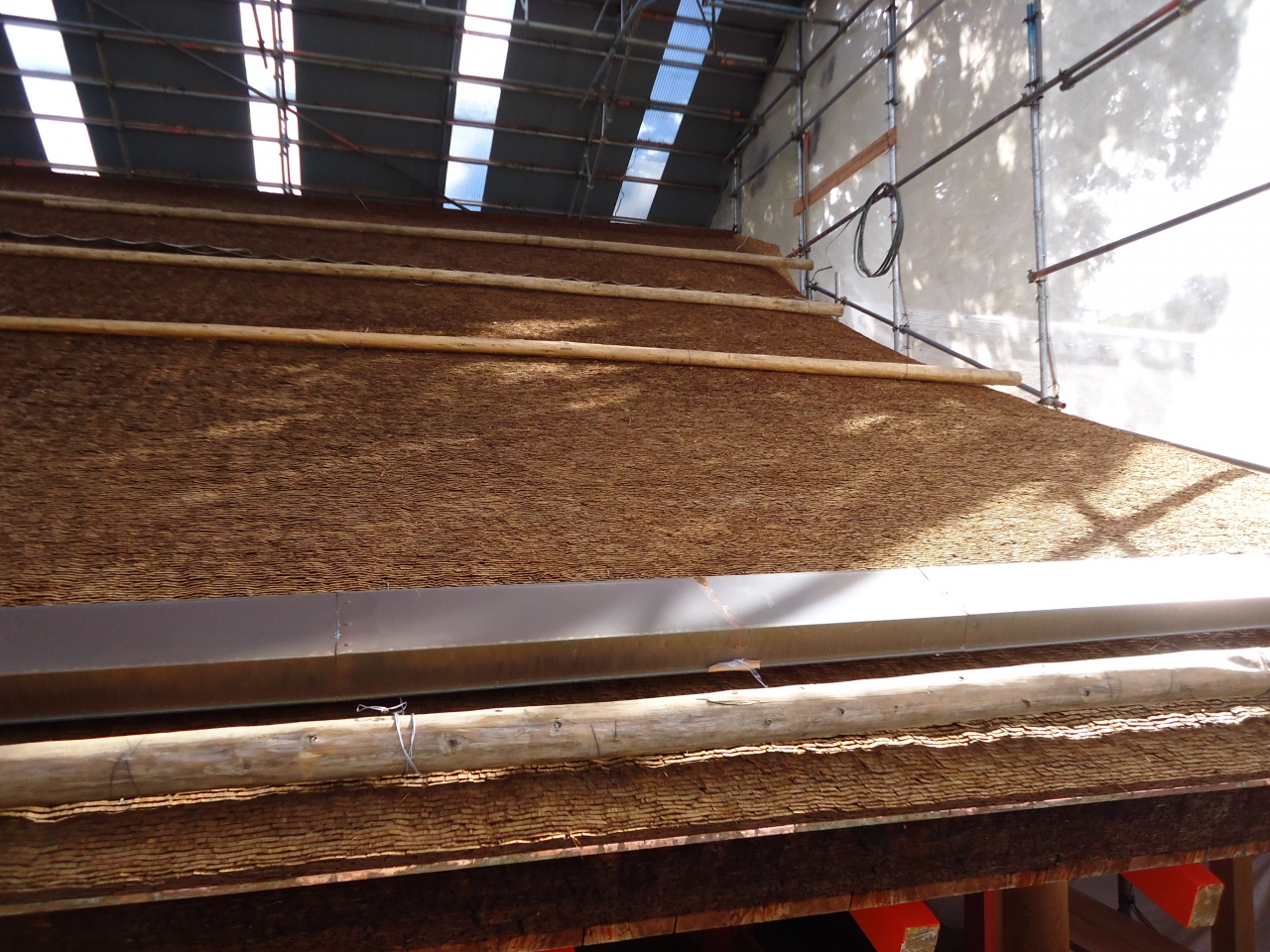 神社職員さんのご案内のもと、屋根を檜皮で葺く様子を見学しました。