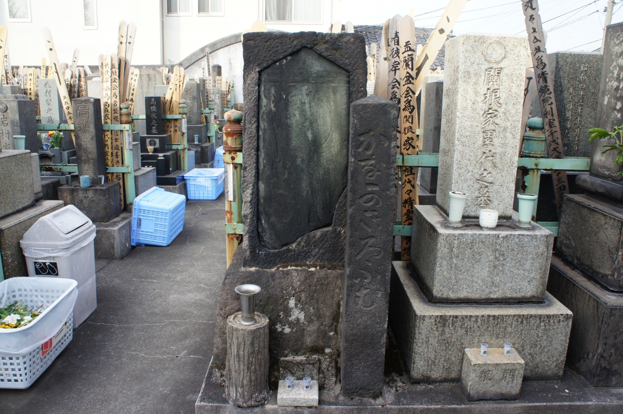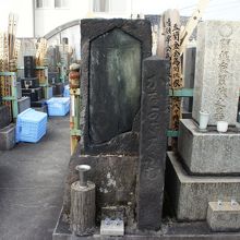 一段高いところに墓地があって、ちょっと見つけにくいかもしれませんが、仮名垣魯文の墓というのがありました。かながきろぶんとひらがなで石の杭が建っています。ところで、墓石は板碑。聖観音を彫刻したもので、自然石にはめ込まれています。