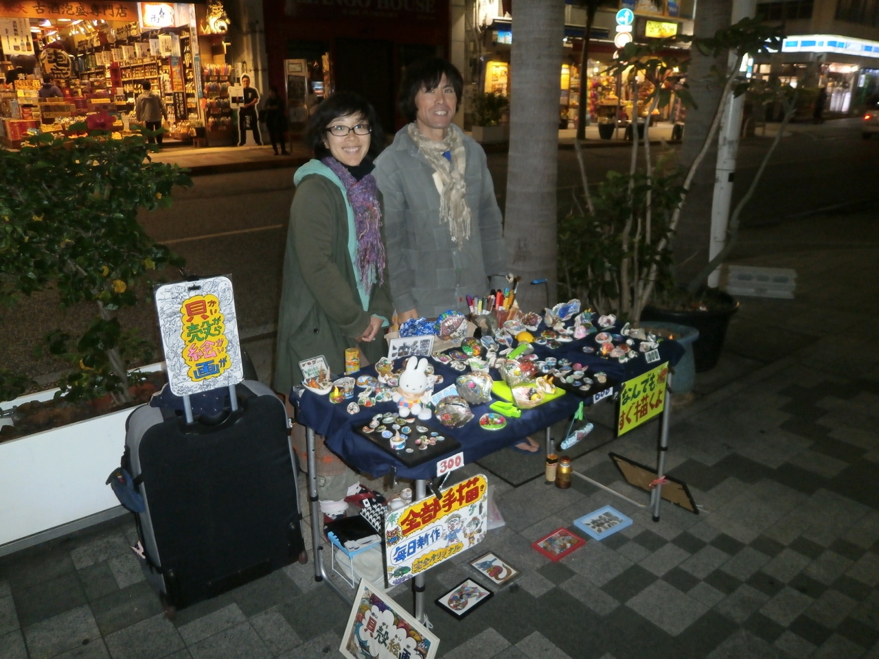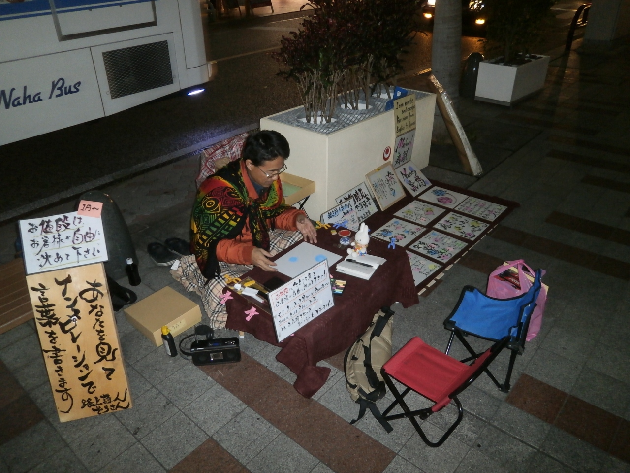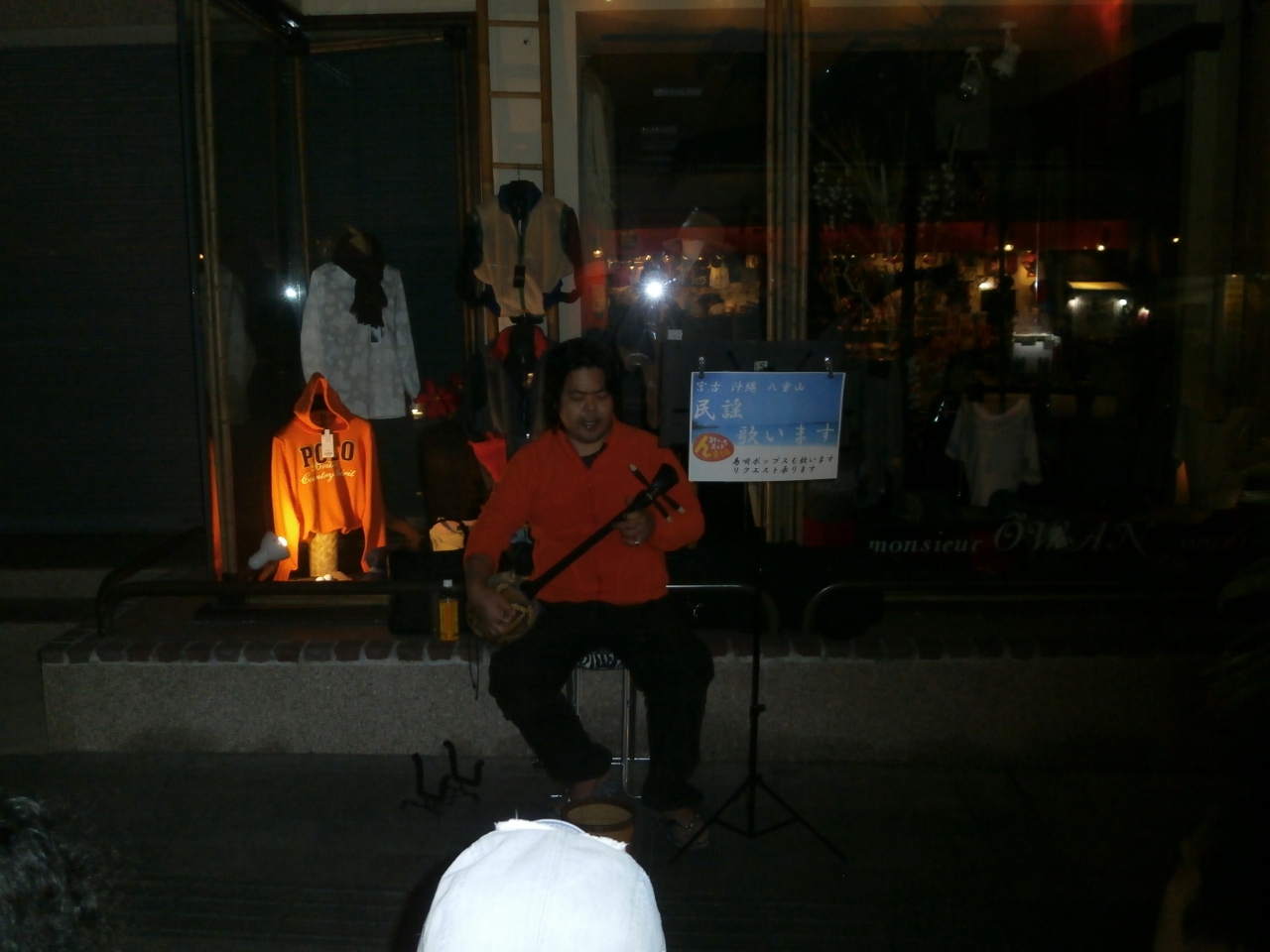 路上詩人やミュージシャン、沖縄の民謡楽器で民謡を唄う方がいました。