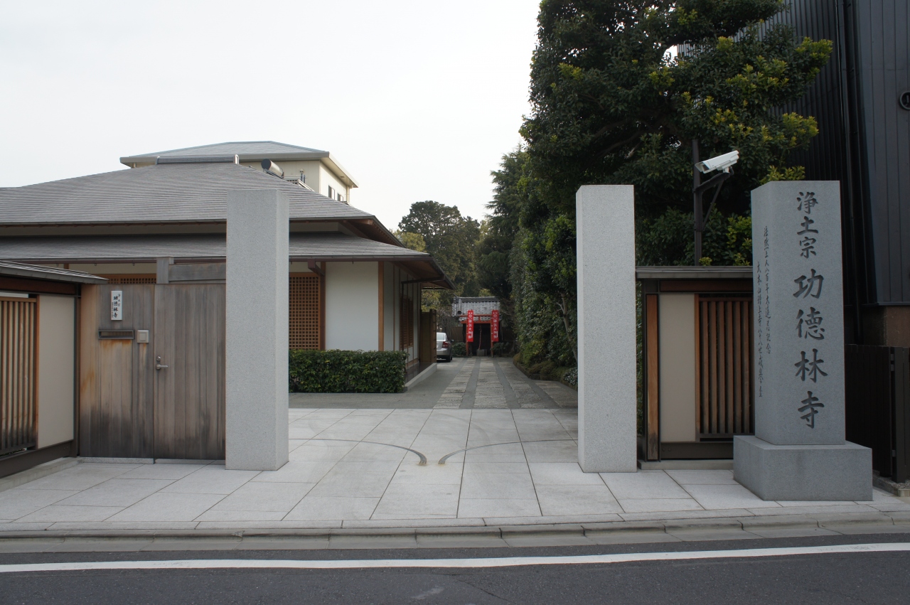 功徳林寺は、門前に、寺の名前を刻んだ大きな石柱が目立ちます。門を入ると、左手にけっこう新しい本堂。全体的に近代的な雰囲気です。ただ、なんでも「明和の美女お仙人」が、水茶屋で働いていた笠森稲荷跡に建っているのだそう。明和の美女お仙人って、有名なんでしょうか。よくわかりません。