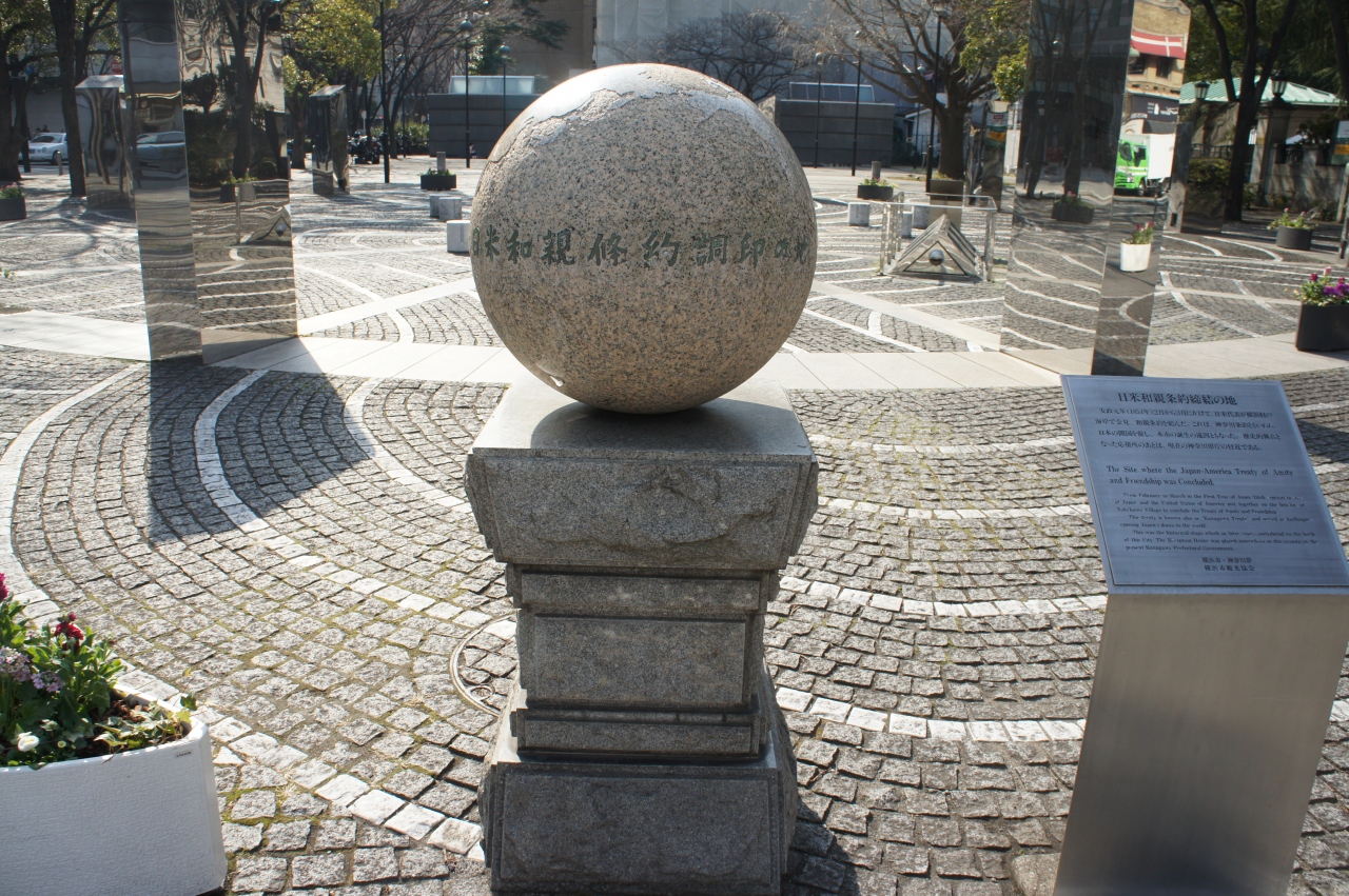 開港広場の一角にあるのが、日米和親条約締結の碑。石で出来た丸い地球儀に文字が刻まれている、ちょっとしたモニュメントのようなものです。確かに歴史的な意味は小さくないと思いますが、反面、今の時代の問題は当時よりずっと複雑になっているような。奇妙な気持ちになりました。