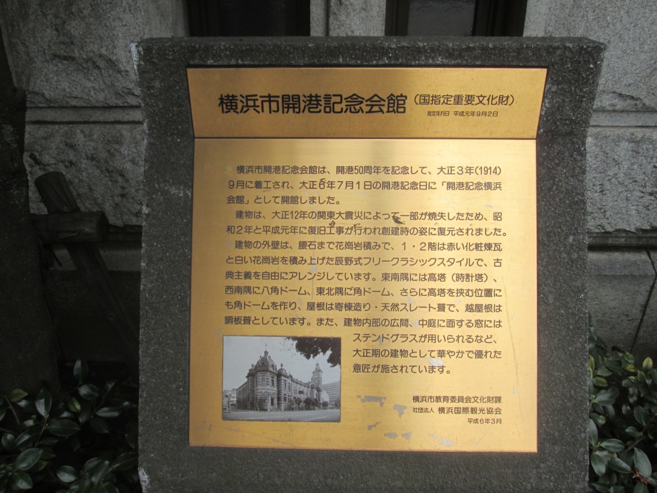 横浜開港50周年を記念し、大正7年に開港記念横浜会館として開館した赤煉瓦の歴史的建造物で、美しい時計台(ジャックの塔)で有名です。関東大震災で被災したものの、創建時と同じスタッフで復旧したということです。また当時は復旧されなかったドーム部分も、平成元年に大正期のデザインのまま復元されました。クラシックな外観はもちろん、館内も大正モダンといったデザインで、美しいステンドグラスも2か所にあり、まさに大正時代の雰囲気が伝わって来ます。時計台(ジャックの塔)は神奈川県庁(キング)・横浜税関(クイーン)と共に”横浜三塔”を形成しており、毎年”横濱三塔の日”に合わせて塔に上ることができます。