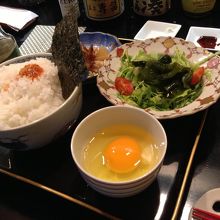 今回はランチパスポートを使い卵かけご飯500円を注文。鯛の味噌汁、煮物小鉢、サラダが付いてきます。九州の珍しい醤油を勧められ、色々試しながら食べれます。気に入った醤油は後で購入できます。