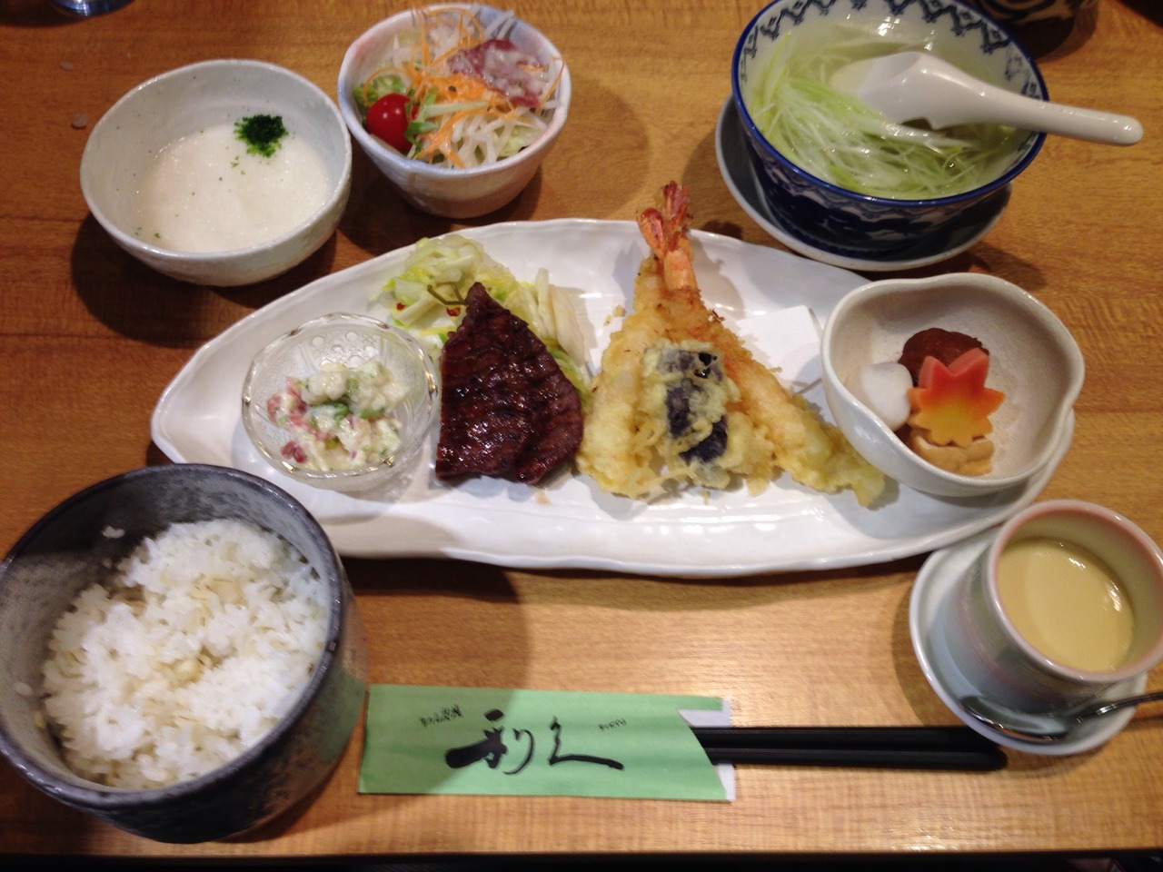 レディース定食は厚切り牛タン、天ぷら、テールスープ、サラダ、茶碗蒸し、小鉢と、少しずつ盛り合わせられています。