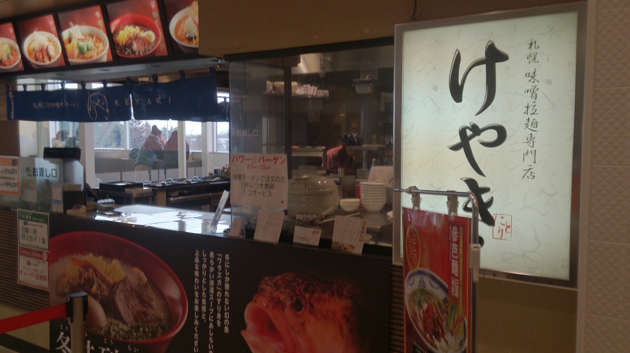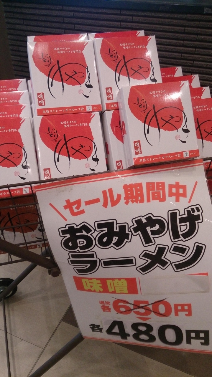 北広島の三井アウトレットパークの2階、フードコートの一番奥にあります。一番奥のせいか、あまり混んでいない様な気がしました。店のカウンター前にお土産ラーメンの味噌味を発見。空港では650円なのに、ここでは480円でした。さすがアウトレットパーク。4つ買って家で食べる事にしました。