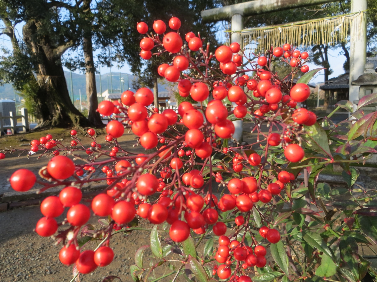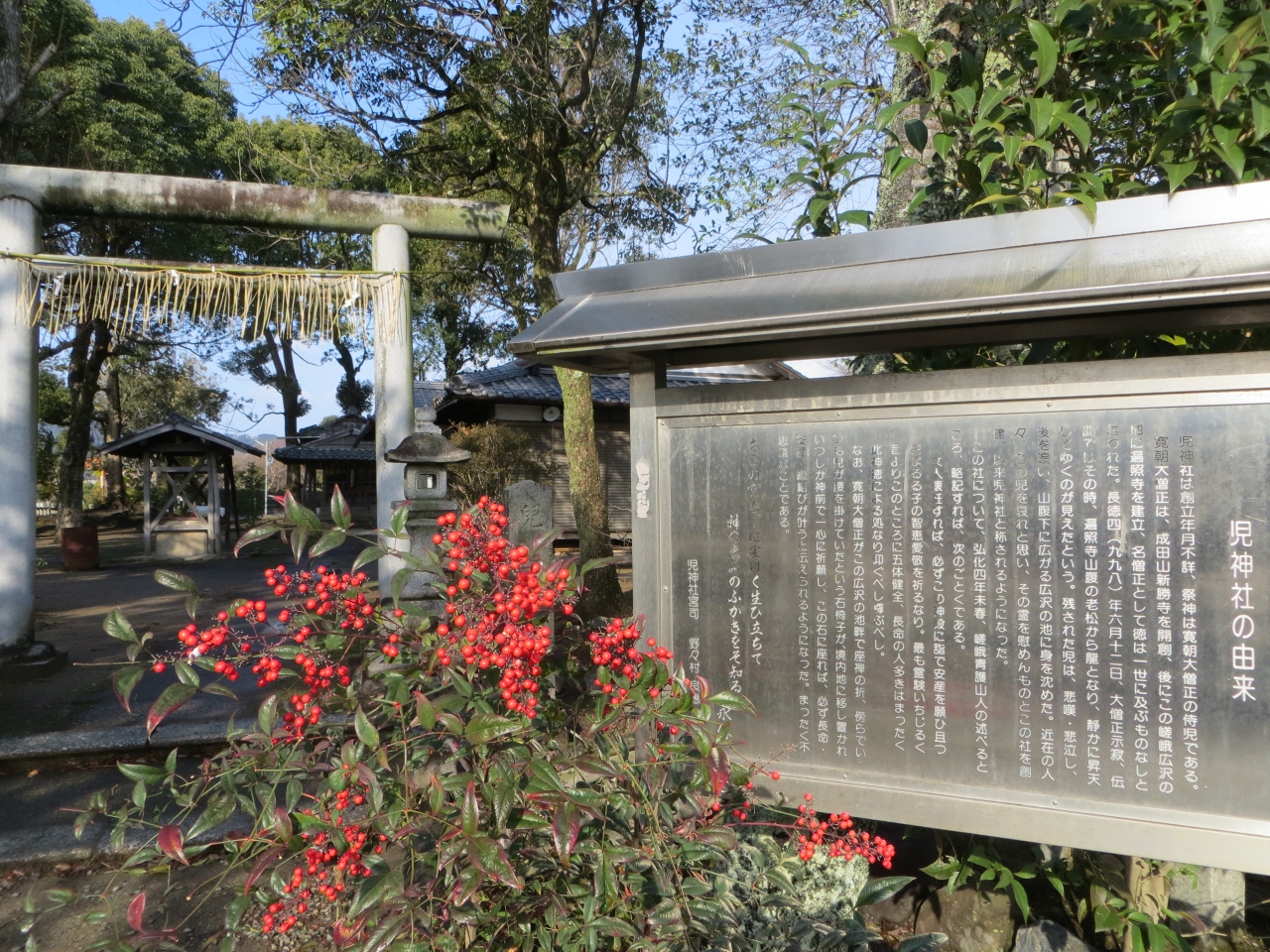 京都マラソンを見学に広沢池に行きました。児神社はその広沢池湖畔にある小さな地元の神社です。こんなところにもやはり京都、観光ガイドブックには登場しませんが何とも風情のある神社です。境内には南天の実が赤く光っていました。