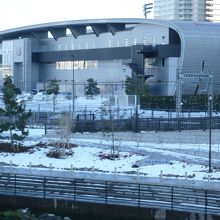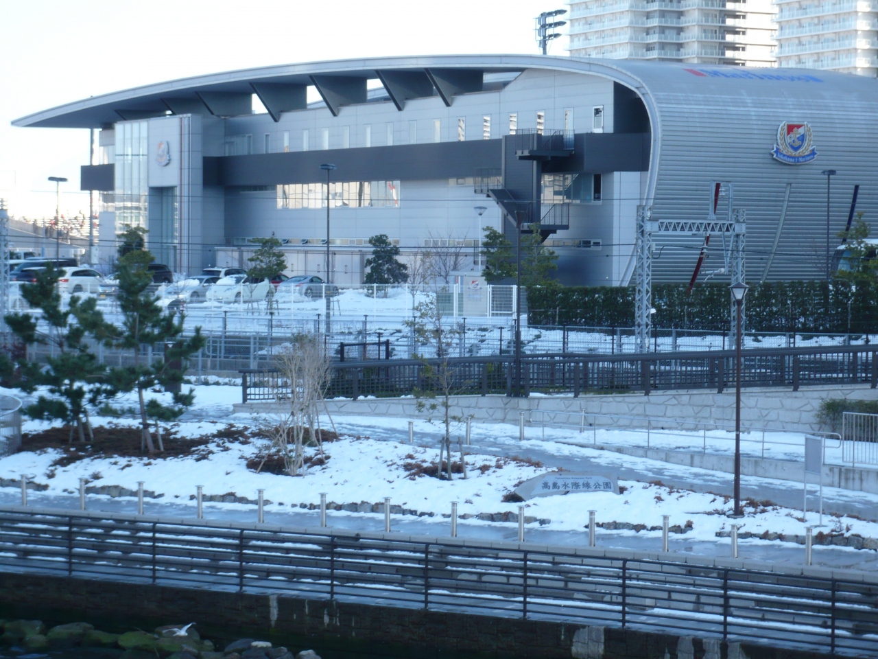 帷子川沿いにある細長い公園です。水際線プロムナードと直結しているので、お散歩がてら立ち寄って休憩できるスポットになっていますが、訪れた日が雪の次の日で雪に埋もれて人影のない状況でした。目の前をシーバスが通るのを対岸のポートサイド地区を背景に眺められます。