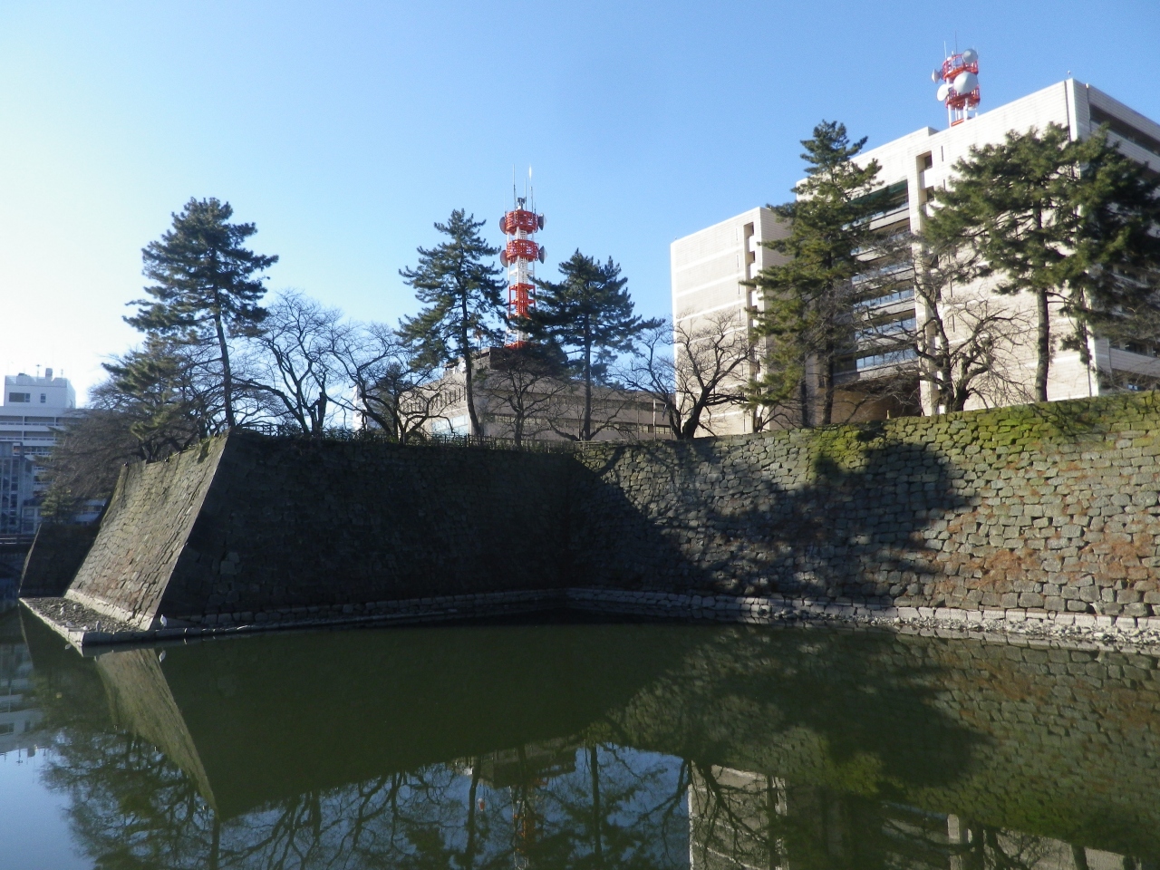 福井駅から北西に約5分歩くと福井城址のお堀に出ます、お堀沿いには内堀公園、御本城橋を渡ると福井城址に入ります、城址には福井県庁と福井県警本部があります、北西側に天守台があります、初代福井藩主結城秀康が慶庁6年(1601)から6年かけて築城、現在残っているのは本丸石垣と内堀のみです。