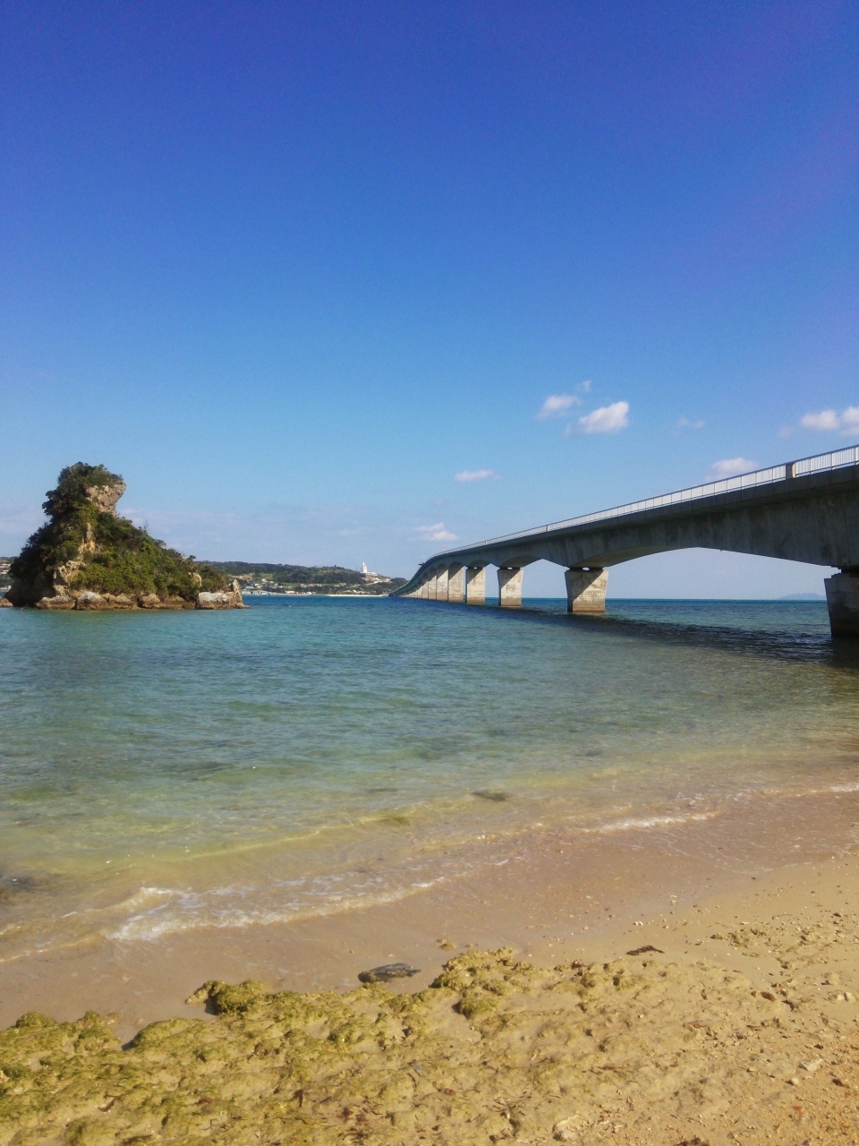 沖縄本島と古宇利島をつなぐ大橋で、橋の手前に駐車場付きの休憩所があり、そこから橋の姿を眺める事が出来ます。天気が良く、青い海と橋の終着点である古宇利島が良く見え、とても良い景色でした。休憩所には施設はありませんが、コーヒーやアクセサリー店などの出店が出ていました。