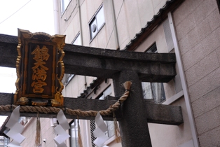 昭和十年代に建てられた鳥居であるが、その後まわりにビルが建てられたため、鳥居の一部がビルの中にめり込んでいるのである。これはなかなか面白い。