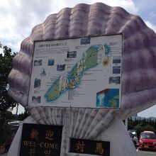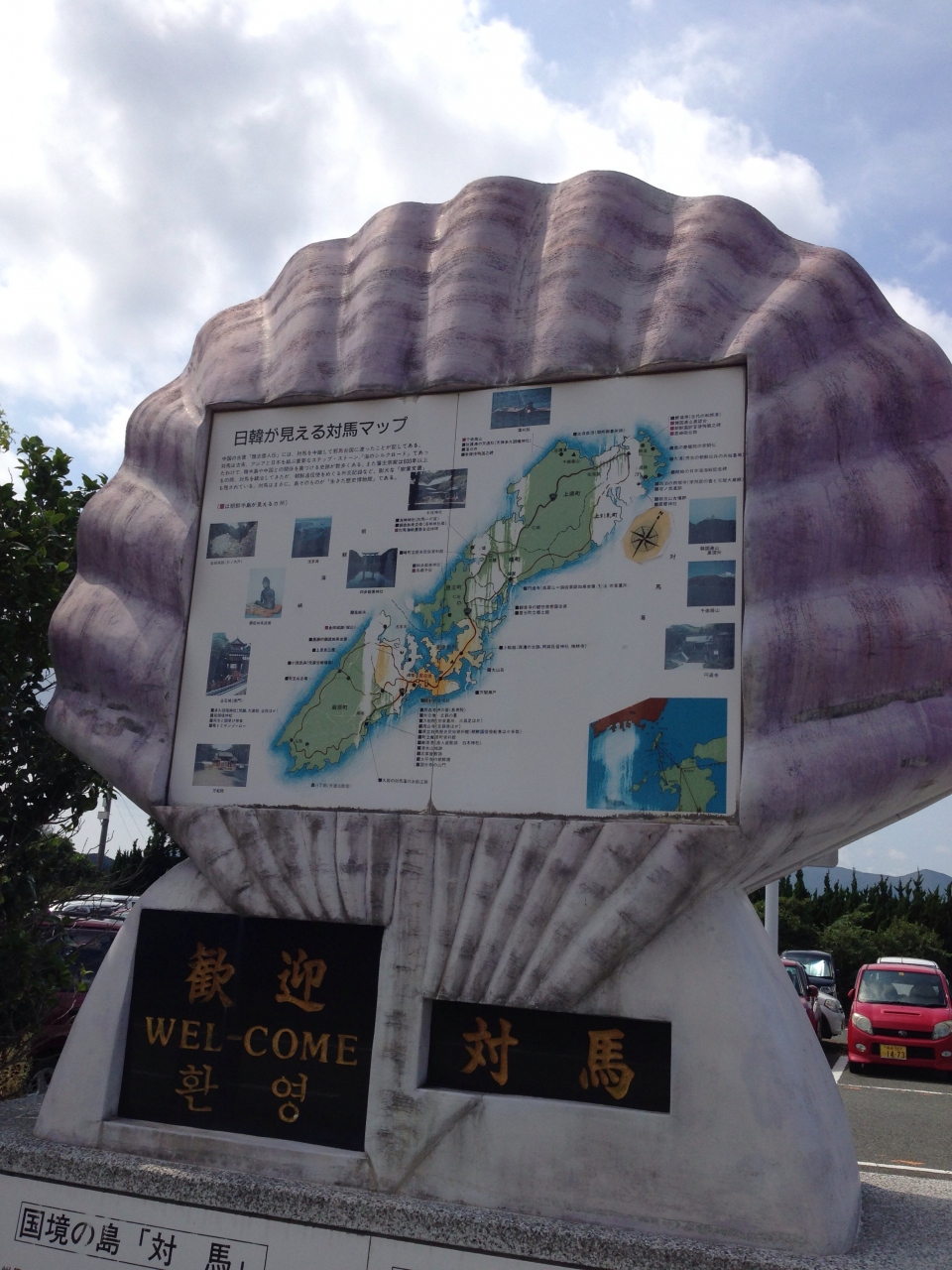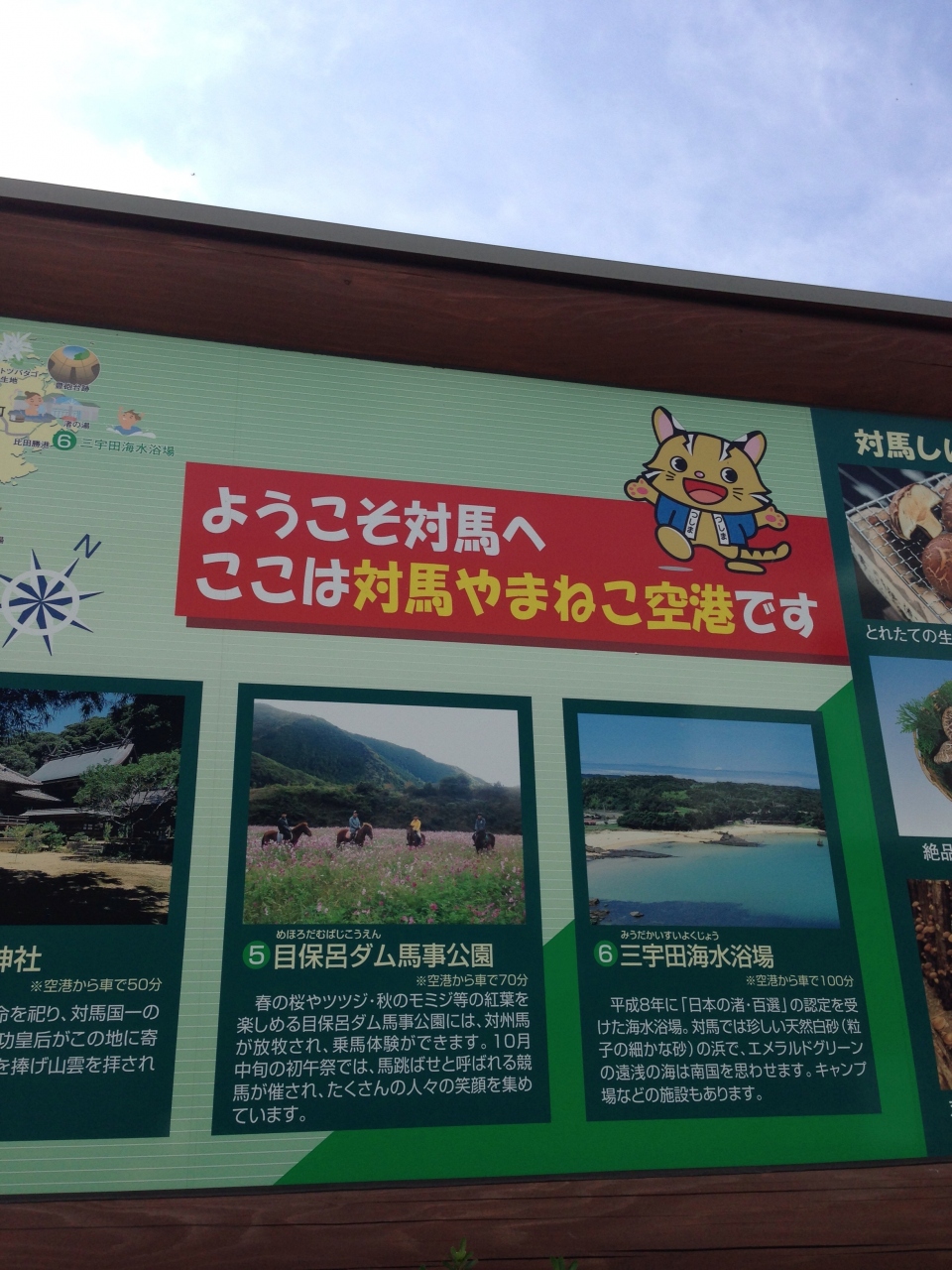 対馬の観光地図がありましたが、広い島です。空港から飛び立った景色は、断崖の島の印象です。