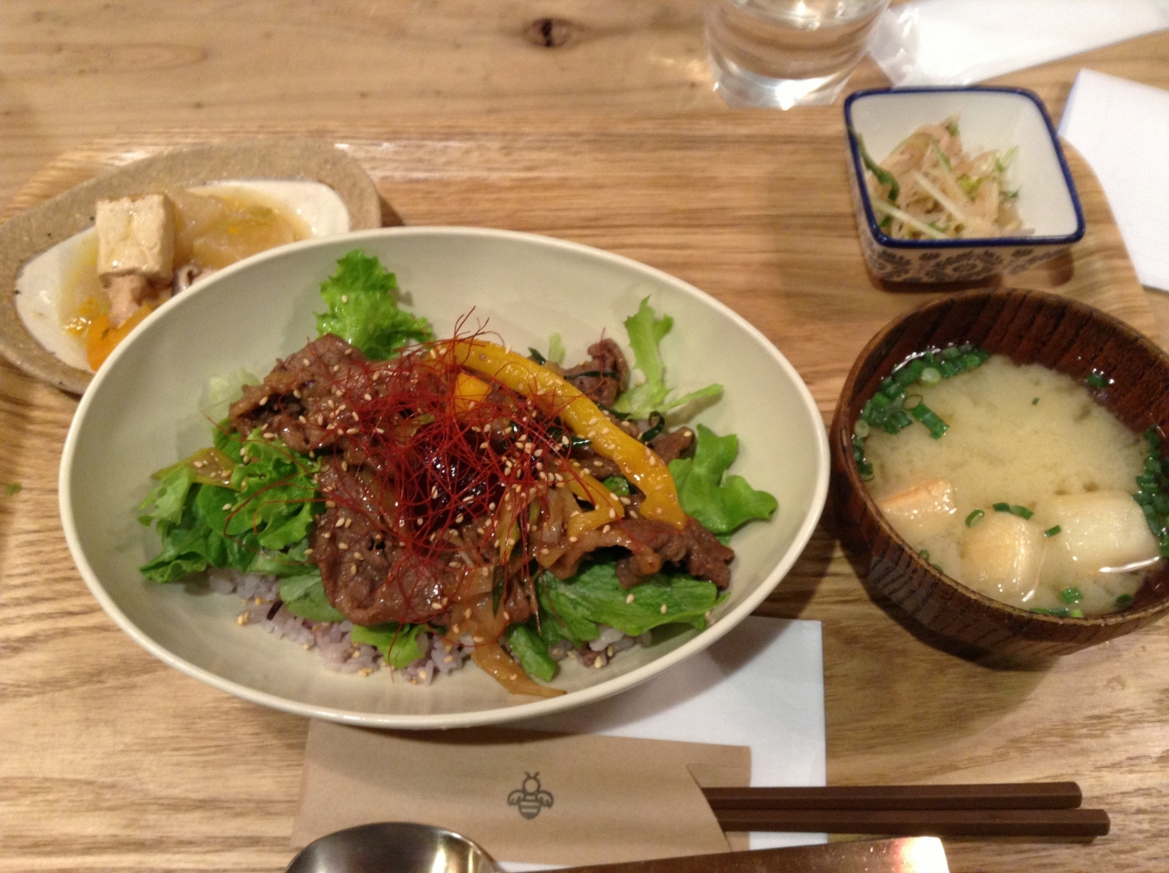 プルコギは、肉が若干大きく食べ辛いですが、辛さは控えめで美味しかったです。あっさりした煮物系の小鉢が二品ついてくるのも嬉しいです。