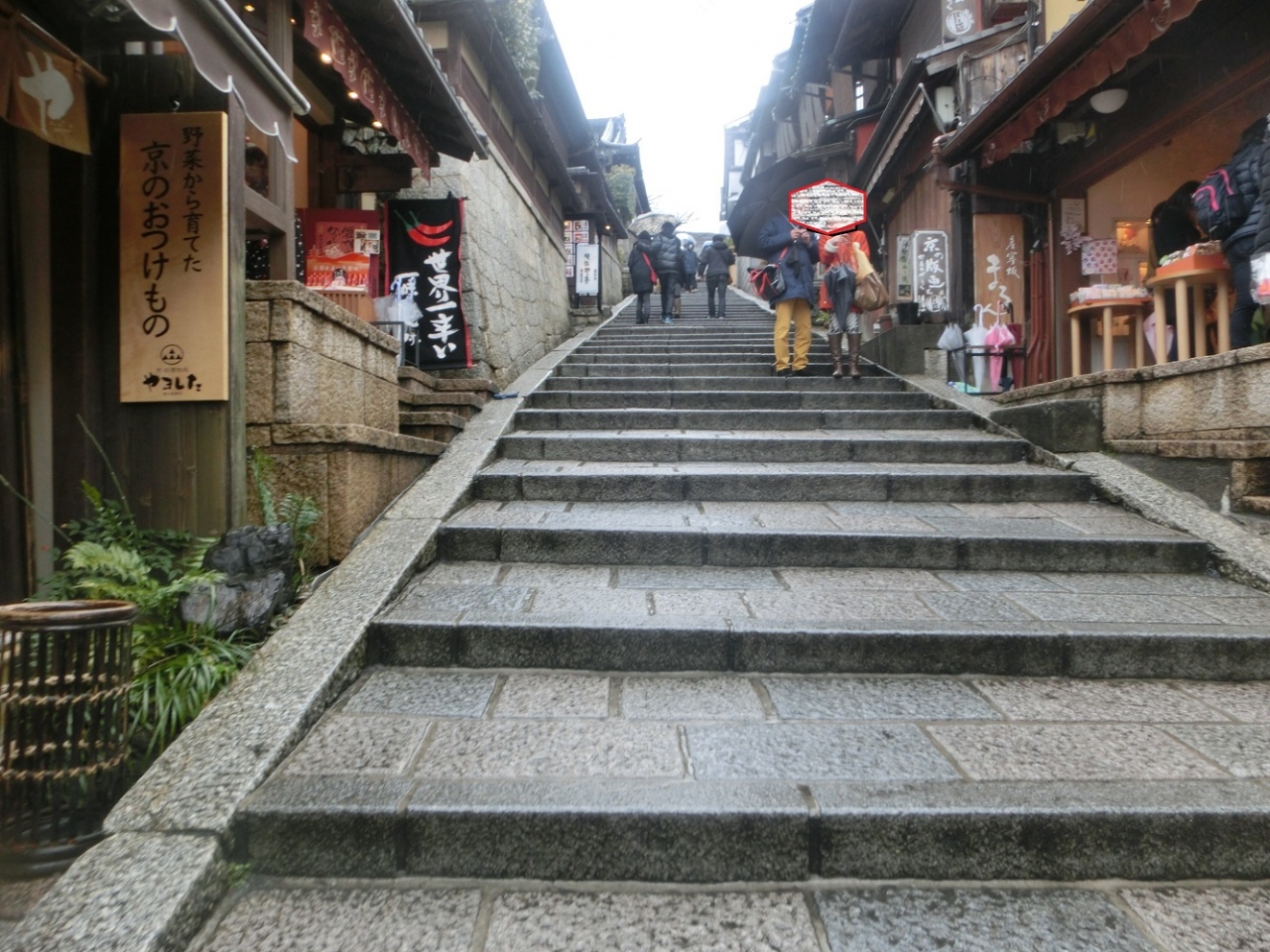 友人たちと、京都市内を円山公園から清水寺に向かう時に、三年坂を通って清水坂に向かいました。三年坂付近は、坂の両側にはいろいろなお店が立ち並び、雨の中でも多くの観光客で賑わっています。