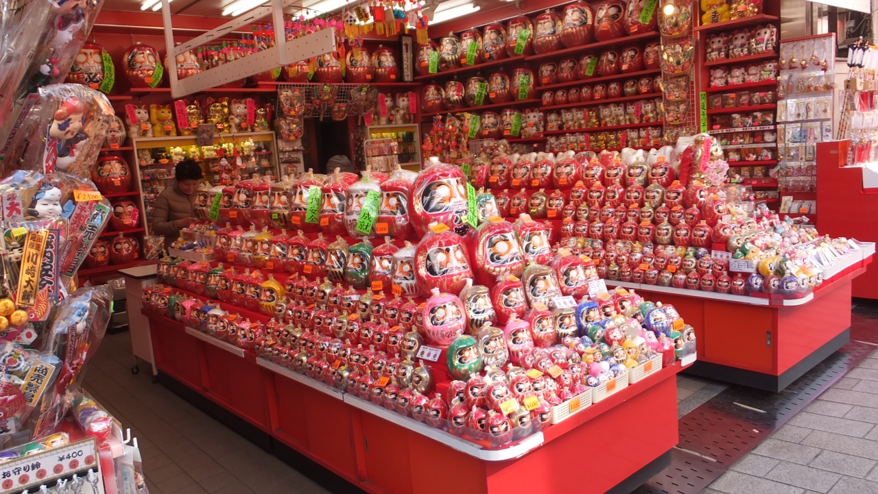 飴、だるま、久寿餅、七味、お箸、せんべいなどのおみやげ屋さんが並びます。