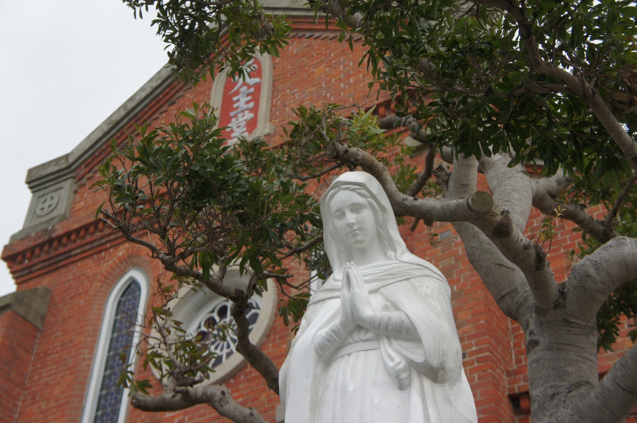 青砂ヶ浦天主堂は、頭が島教会と並んで世界遺産登録の候補とする話もあったようですが、この辺りは信者の力が強くて、登録した後の制約条件等を考えた時に不都合があって断念したという教会です。ただ、国指定重要文化財とはなっていて、レンガ造りの外観はとても重厚な印象。内部の幾何学的なステンドグラスに、高いこうもり天井の見事さも目を見張ります。