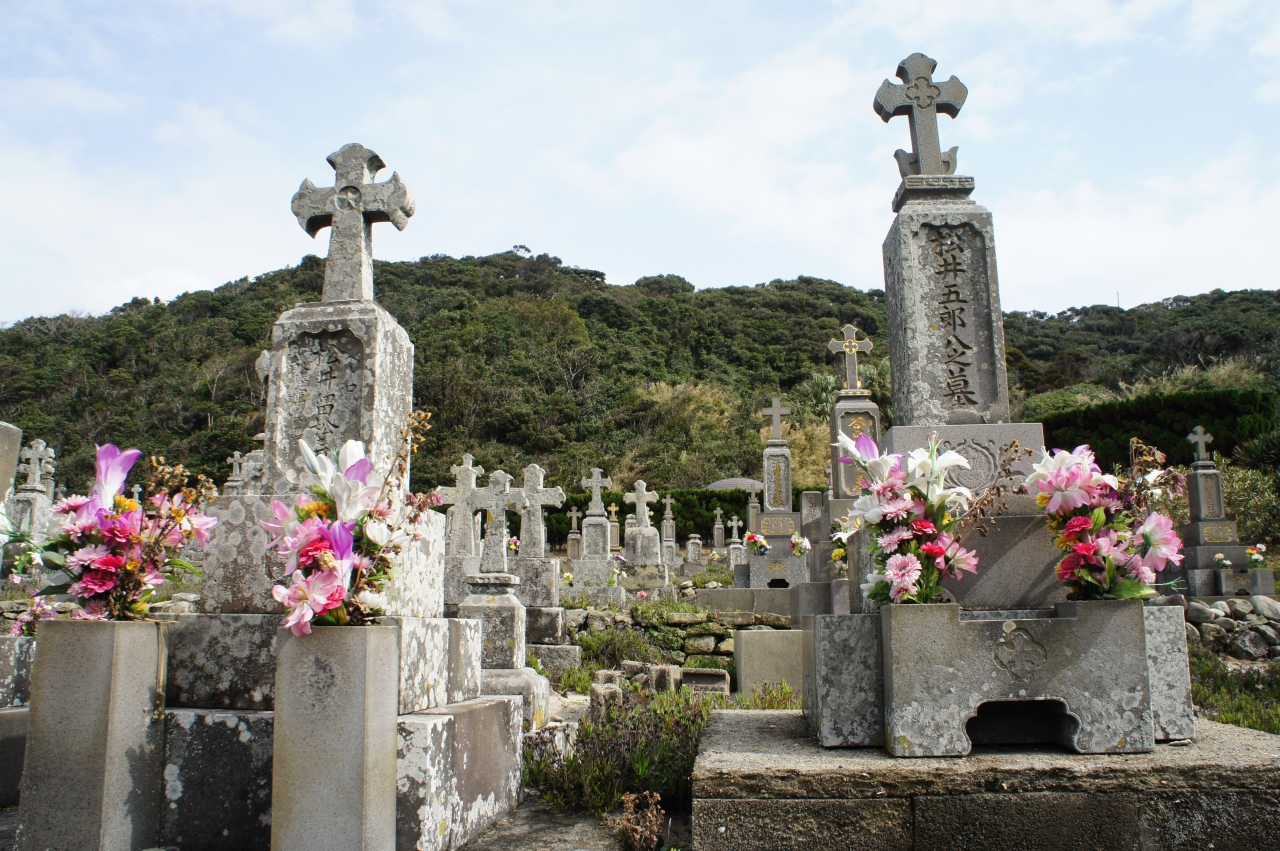 頭ヶ島教会から、海側に歩くとすぐに見えてくるのがキリシタン墓地。美しい入江に望む緩やかな斜面を利用した墓地です。上に十字架を乗せた墓石が点々と立ち並んでいました。それぞれには鮮やかな花も活けられて、厚い信仰が墓の様子からも自然と偲ばれました。