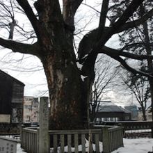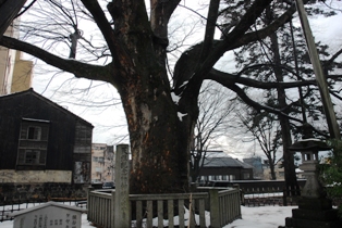 犀川大橋にも近い神明宮は、300年以上続く「あぶり餅神事」でも知られる神社である。境内にそびえる大きなケヤキは、樹齢千年以上と推定されており、戦前は神明の大ケヤキとして天然記念物に指定されていた保存樹木である。