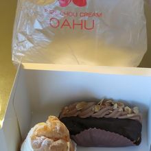 京都市上京区堀川今出川上る東側にありまするシュークリームカフェ オアフ 京都西陣本店の フレッシュクリームシューはシューの下側にカスタードの敷かれ、その上にシューから溢れるほど北海道生クリームが盛られ、クリーム系シュークリームとしては値段も安く(220円)で美味しいです。今回は一緒にエクレアを買って帰りました。