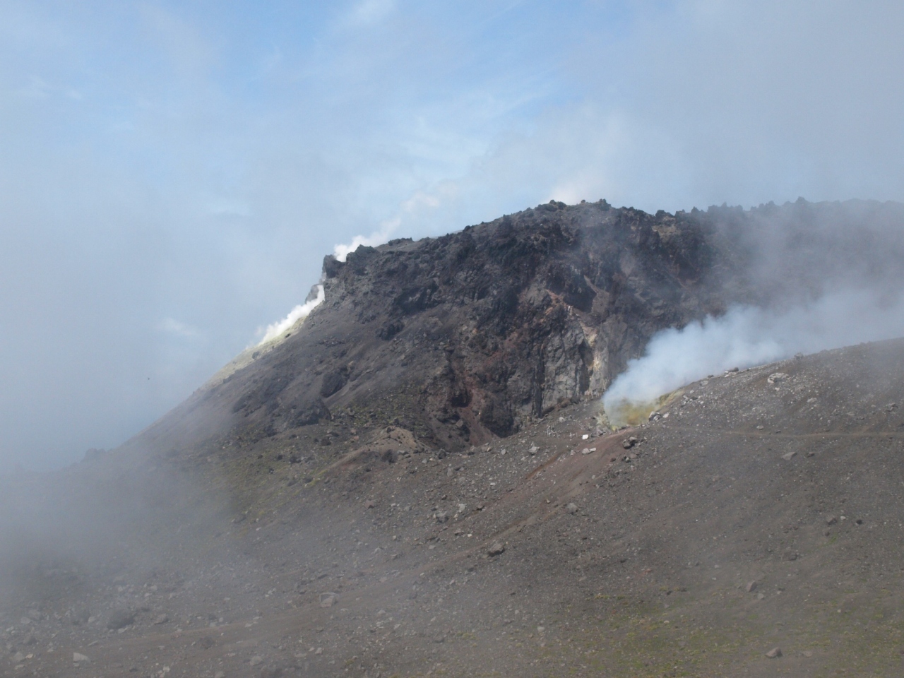 時折り噴煙を上げる溶岩ドームの周辺は地肌が露出し荒涼とした風景となっています。初夏にはタルマエソウを初めとした高山植物が一面に花を咲かせます。北側には風不死岳1102mが連なっています。