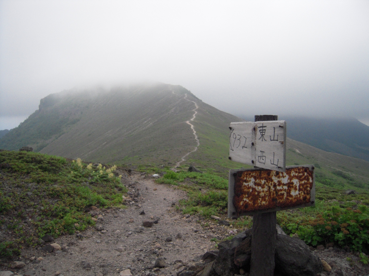 そこから、しばらくは階段状の登山道をまっすぐ登っていく感じで、東西の分岐点で初めてドームを目の当たりにします。右手は東山(1022m)。樽前山の外輪山の中で一番高い山です。